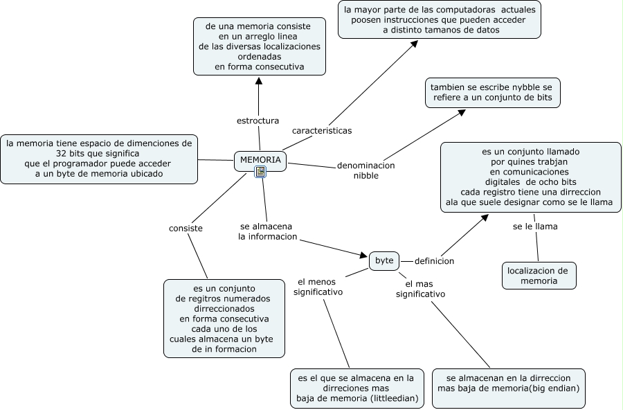 This Concept Map, created with IHMC CmapTools, has information related to: mapa memoria oscar, es un conjunto llamado por quines trabjan en comunicaciones digitales de ocho bits cada registro tiene una dirreccion ala que suele designar como se le llama se le llama localizacion de memoria, MEMORIA caracteristicas la mayor parte de las computadoras actuales poosen instrucciones que pueden acceder a distinto tamanos de datos, byte el menos significativo es el que se almacena en la dirreciones mas baja de memoria (littleedian), MEMORIA ???? la memoria tiene espacio de dimenciones de 32 bits que significa que el programador puede acceder a un byte de memoria ubicado, MEMORIA denominacion nibble tambien se escribe nybble se refiere a un conjunto de bits, MEMORIA se almacena la informacion byte, byte el mas significativo se almacenan en la dirreccion mas baja de memoria(big endian), MEMORIA estroctura de una memoria consiste en un arreglo linea de las diversas localizaciones ordenadas en forma consecutiva, MEMORIA consiste es un conjunto de regitros numerados dirreccionados en forma consecutiva cada uno de los cuales almacena un byte de in formacion, byte definicion es un conjunto llamado por quines trabjan en comunicaciones digitales de ocho bits cada registro tiene una dirreccion ala que suele designar como se le llama