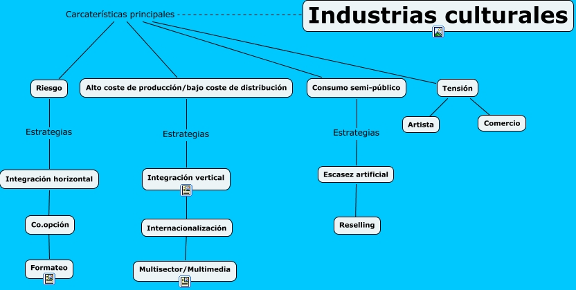 Este Cmap, tiene información relacionada con: covadongacanitrot_caracteristicasindustria, Industrias culturales Carcaterísticas principales Consumo semi-público, Consumo semi-público Estrategias Escasez artificial, Industrias culturales Carcaterísticas principales Tensión, Industrias culturales Carcaterísticas principales Riesgo, Industrias culturales Carcaterísticas principales Alto coste de producción/bajo coste de distribución, Integración horizontal ???? Formateo, Escasez artificial ???? Reselling, Tensión ???? Artista, Tensión ???? Comercio, Riesgo Estrategias Integración horizontal, Integración vertical ???? Multisector/Multimedia, Alto coste de producción/bajo coste de distribución Estrategias Integración vertical