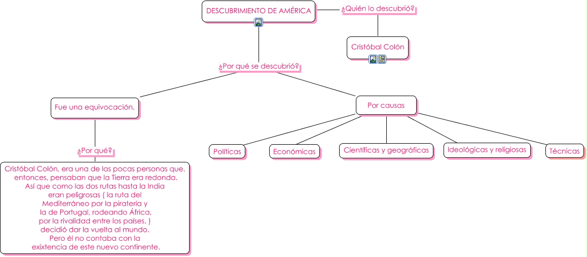 Este Cmap, tiene información relacionada con: Descubrimiento América, Políticas Por causas, Fue una equivocación. ¿Por qué? Cristóbal Colón, era una de las pocas personas que, entonces, pensaban que la Tierra era redonda. Así que como las dos rutas hasta la India eran peligrosas ( la ruta del Mediterráneo por la piratería y la de Portugal, rodeando África, por la rivalidad entre los países. ) decidió dar la vuelta al mundo. Pero él no contaba con la exixtencia de este nuevo continente., DESCUBRIMIENTO DE AMÉRICA ¿Por qué se descubrió? Por causas, DESCUBRIMIENTO DE AMÉRICA ¿Por qué se descubrió? Fue una equivocación., DESCUBRIMIENTO DE AMÉRICA ¿Quién lo descubrió? Cristóbal Colón, Económicas Por causas, Técnicas Por causas, Científicas y geográficas Por causas, Ideológicas y religiosas ???? Por causas