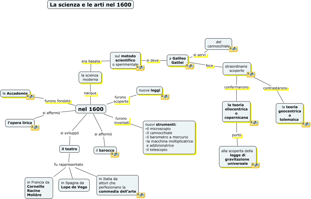 Questa Cmap, creata con IHMC CmapTools, contiene informazioni relative a: La scienza e le arti nel 1600 (AA), il teatro fu rappresentato in Spagna da Lope de Vega, il teatro fu rappresentato in Francia da Corneille Racine Molière, nel 1600 si affermò l'opera lirica, la teoria eliocentrica o copernicana portò alla scoperta della legge di gravitazione universale, il teatro fu rappresentato in Italia da attori che perfezionano la commedia dell'arte, la scienza moderna era basata sul metodo scientifico o sperimentale, nel 1600 si sviluppò il teatro, straordinarie scoperte confermarono la teoria eliocentrica o copernicana, sul metodo scientifico o sperimentale si deve a Galileo Galilei, a Galileo Galilei si servì del cannocchiale, nel 1600 furono fondate le Accademie, straordinarie scoperte contrastarono la teoria geocentrica o tolemaica, nel 1600 si affermò il barocco, nel 1600 furono inventati nuovi strumenti: -il microscopio -il cannocchiale -il barometro a mercurio -la macchina moltiplicatrice e addizionatrice -il telescopio, nel 1600 furono scoperte nuove leggi, a Galileo Galilei fece straordinarie scoperte, nel 1600 nacque la scienza moderna