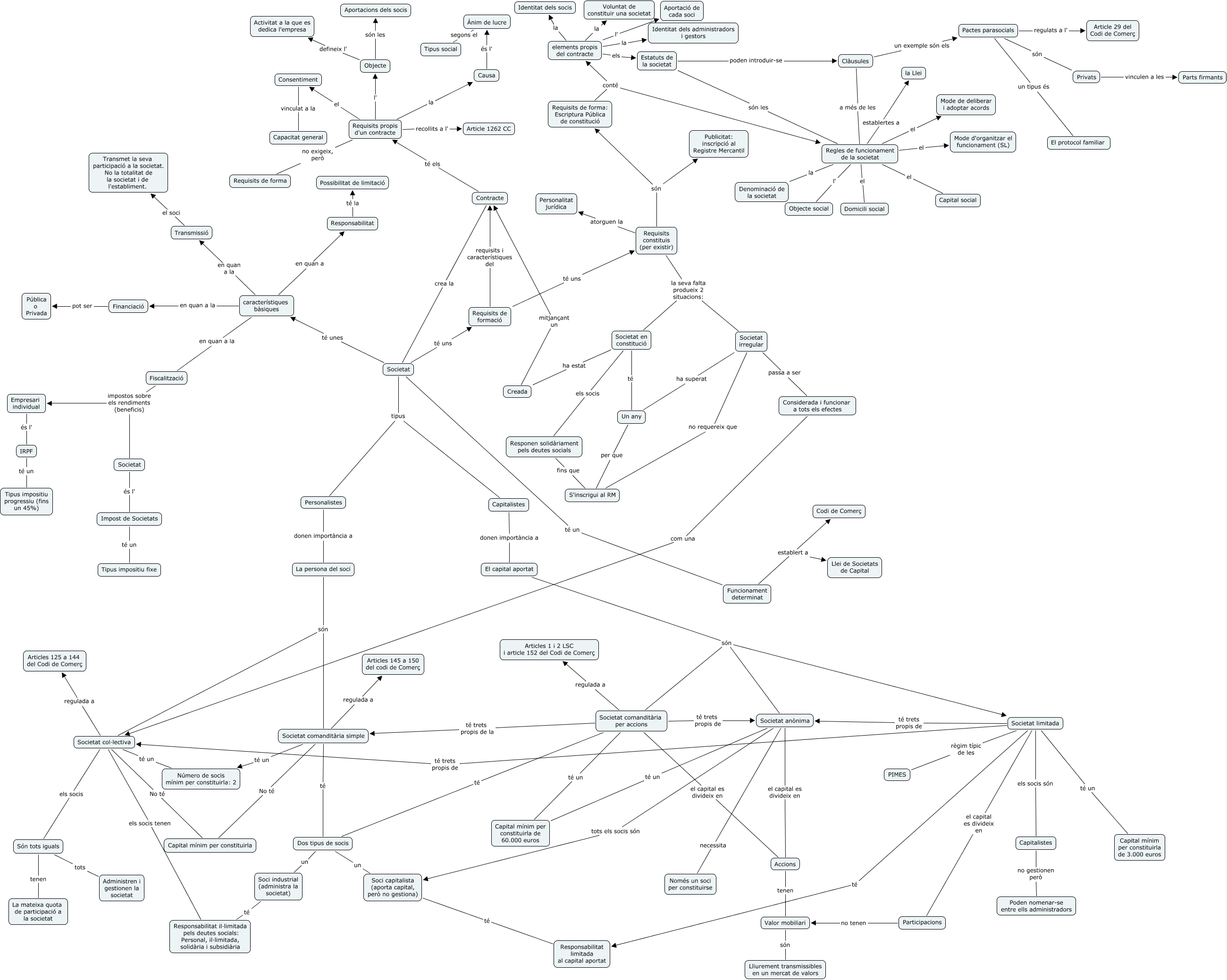 Este Cmap, tiene información relacionada con: Escenari 1 Un negoci familiar, Clàusules a més de les Regles de funcionament de la societat, Capitalistes donen importància a El capital aportat, Requisits constituis (per existir) són Requisits de forma: Escriptura Pública de constitució, Societat limitada règim típic de les PIMES, Societat col·lectiva té un Número de socis mínim per constituirla: 2, Societat en constitució té Un any, Contracte té els Requisits propis d'un contracte, Requisits de forma: Escriptura Pública de constitució conté Regles de funcionament de la societat, elements propis del contracte la Identitat dels socis, Considerada i funcionar a tots els efectes com una Societat col·lectiva, Dos tipus de socis un Soci industrial (administra la societat), Requisits de formació requisits i característiques del Contracte, Fiscalització impostos sobre els rendiments (beneficis) Empresari individual, Societat comanditària simple té Dos tipus de socis, Societat col·lectiva No té Capital mínim per constituirla, El capital aportat són Societat limitada, Accions tenen Valor mobiliari, Objecte són les Aportacions dels socis, elements propis del contracte la Identitat dels administradors i gestors, Societat comanditària simple regulada a Articles 145 a 150 del codi de Comerç