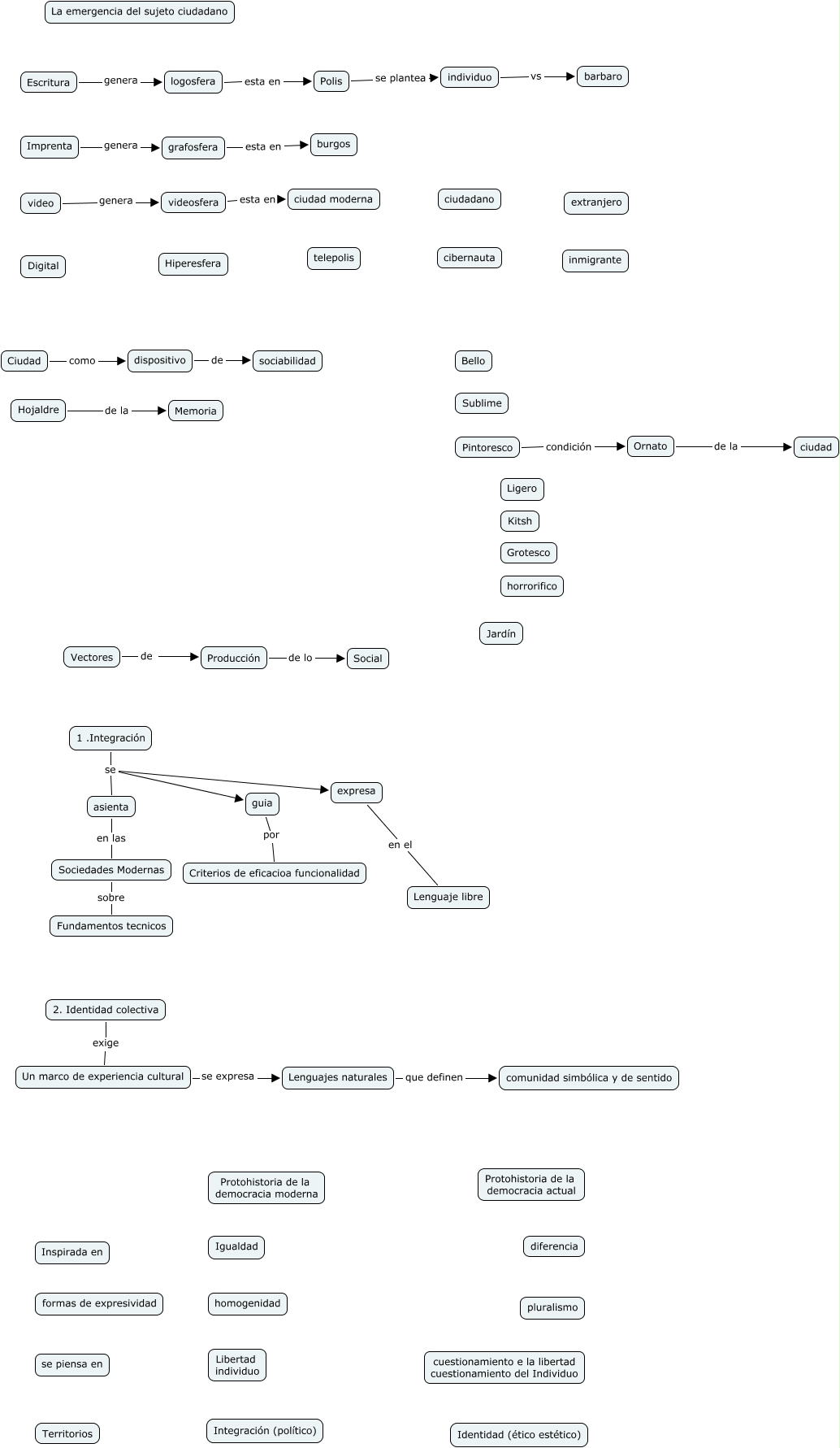 Este Cmap, tiene información relacionada con: La emergencia del sujeto ciudadano, Un marco de experiencia cultural se expresa Lenguajes naturales, 1 .Integración se expresa, 1 .Integración se asienta, Hojaldre de la Memoria, Ciudad como dispositivo, expresa en el Lenguaje libre, 1 .Integración se guia, Vectores de Producción, Imprenta genera grafosfera, Ornato de la ciudad, Escritura genera logosfera, logosfera esta en Polis, videosfera esta en ciudad moderna, asienta en las Sociedades Modernas, Sociedades Modernas sobre Fundamentos tecnicos, Polis se plantea individuo, video genera videosfera, guia por Criterios de eficacioa funcionalidad, Pintoresco condición Ornato, Lenguajes naturales que definen comunidad simbólica y de sentido
