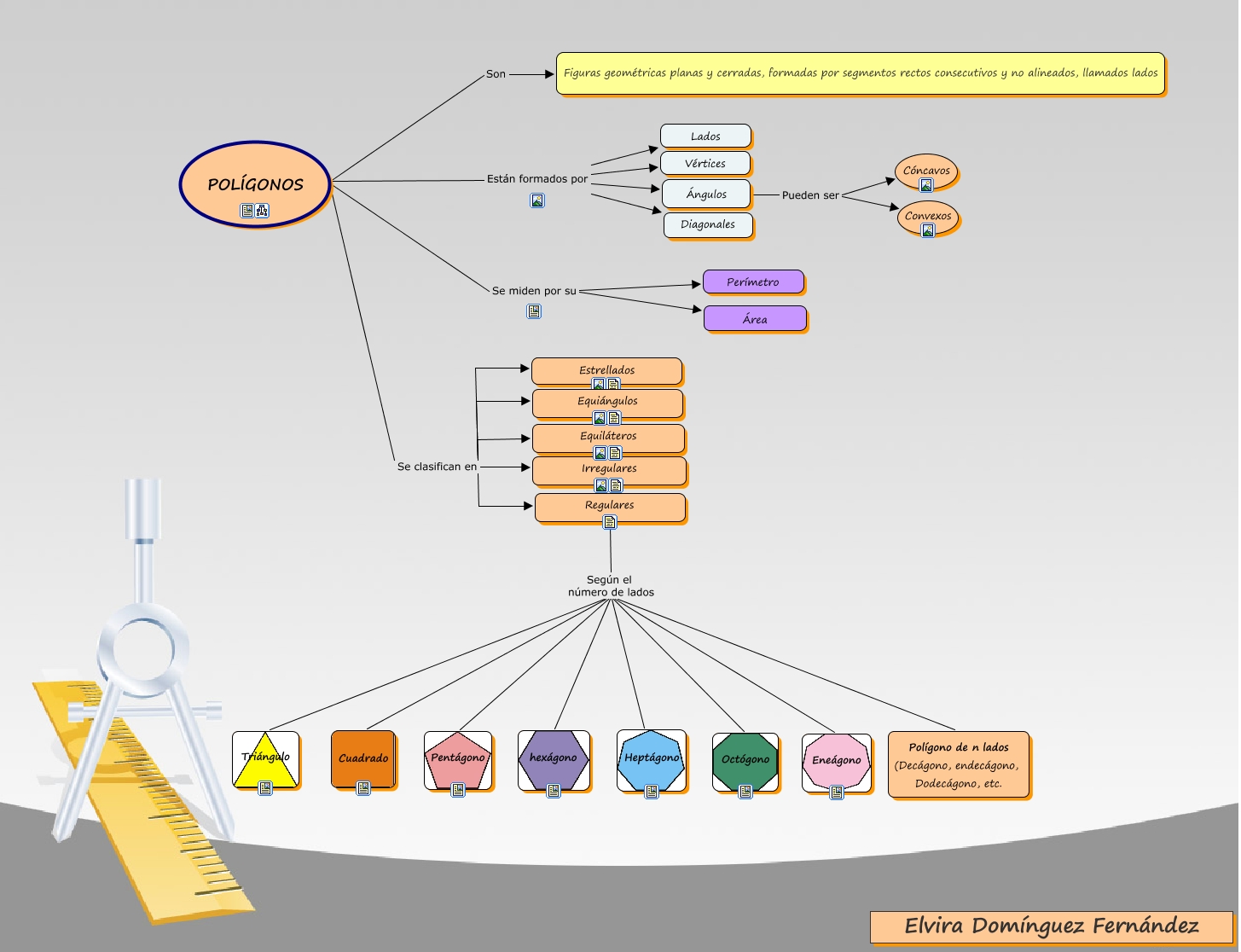 Este Cmap, tiene información relacionada con: Polígonos, Ángulos Pueden ser Cóncavos, POLÍGONOS Son Figuras geométricas planas y cerradas, formadas por segmentos rectos consecutivos y no alineados, llamados lados, Regulares Según el número de lados Octógono, Regulares Según el número de lados Polígono de n lados (Decágono, endecágono, Dodecágono, etc., Regulares Según el número de lados Pentágono, POLÍGONOS Están formados por Ángulos, POLÍGONOS Se miden por su Área, POLÍGONOS Se clasifican en Equiángulos, POLÍGONOS Se clasifican en Irregulares, POLÍGONOS Se miden por su Perímetro, Regulares Según el número de lados hexágono, POLÍGONOS Están formados por Vértices, Regulares Según el número de lados Eneágono, POLÍGONOS Están formados por Diagonales, Regulares Según el número de lados Cuadrado, POLÍGONOS Están formados por Lados, Ángulos Pueden ser Convexos, Regulares Según el número de lados Heptágono, Regulares Según el número de lados Triángulo, POLÍGONOS Se clasifican en Equiláteros