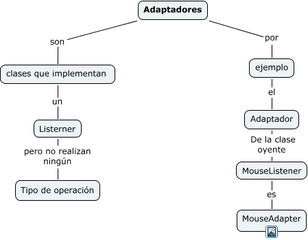 Este Cmap, tiene información relacionada con: 2.Adaptadores, ejemplo el Adaptador, Listerner pero no realizan ningún Tipo de operación, Adaptador De la clase oyente MouseListener, Adaptadores por ejemplo, Adaptadores son clases que implementan, MouseListener es MouseAdapter, clases que implementan un Listerner