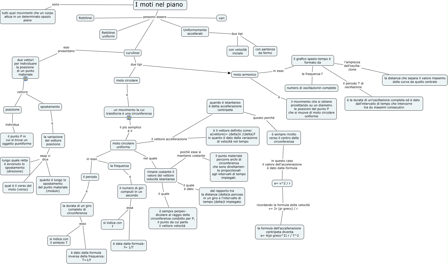 Questa Cmap, creata con IHMC CmapTools, contiene informazioni relative a: i moti nel piano, moto circolare uniforme in esso il periodo, Uniformemente accellerati due tipi con partenza da fermo, Uniformemente accellerati due tipi con velocità iniziale, la durata di un giro completo di circonferenza esso si indica con il simbolo T, il grafico spazio-tempo è formato da la frequenza f numero di oscillazionin complete, quando è istantaneo è detta accellerazione centripeta questo perchè è sempre rivolto verso il centro della circonferenza, moto armonico in esso il grafico spazio-tempo è formato da, la frequenza è il numero di giri compiuti in un secondo, rimane costante il valore del vettore velocità istantanea poichè essa si mantiene costante il punto materiale percorre archi di circonferenza che sono direttamen- te proporzionali agli intervalli di tempo impiegati., I moti nel piano possono essere vari, la variazione del vettore posizione essp ci dice quanto è lungo lo spostamento del punto materiale (modulo), moto circolare uniforme il vettore accellerazione è il vettore definito come: a(vettore)= (delta)V /(delta)T in quanto è dato dalla variazione di velocità nel tempo, moto armonico è il movimento che si ottiene proiettando su un diametro le posizioni del punto P che si muove di moto circolare uniforme, curvilinei due tipi moto armonico, posizione individua il punto P in cui si trova un oggetto puntiforme, I moti nel piano possono essere curvilinei, moto circolare uniforme il vettore accellerazione quando è istantaneo è detta accellerazione centripeta, la variazione del vettore posizione essp ci dice qual è il verso del moto (verso), curvilinei due tipi moto circolare, I moti nel piano sono tutti quei movimenti che un corpo attua in un determinato spazio piano