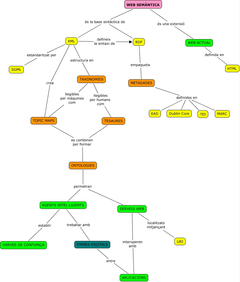 Este Cmap, tiene información relacionada con: Web Semàntica, XML estructura en TAXONOMIES, TOPIC MAPS es combinen per formar ONTOLOGIES, TAXONOMIES llegibles per màquines com TOPIC MAPS, WEB ACTUAL definida en HTML, ONTOLOGIES permetran SERVEIS WEB, XML estandaritzat per SGML, METADADES definides en MARC, ONTOLOGIES permetran AGENTS INTEL·LIGENTS, WEB SEMÀNTICA és la base sintàctica de XML, SERVEIS WEB localitzats mitjançant URI, TAXONOMIES llegibles per humans com TESAURES, XML defineix la sintaxi de RDF, SERVEIS WEB interoperen amb APLICACIONS, RDF empaqueta METADADES, TESAURES es combinen per formar ONTOLOGIES, XML crea TOPIC MAPS, WEB SEMÀNTICA és una extensió WEB ACTUAL, METADADES definides en EAD, WEB SEMÀNTICA és la base sintàctica de RDF, AGENTS INTEL·LIGENTS establir XARXES DE CONFIANÇA