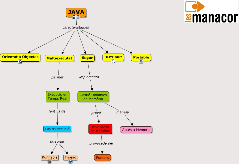 Este Cmap, tiene información relacionada con: 01 JAVA, JAVA característiques Distribuït, Invalidesa de Memòria provocada per Punters, Execució en Temps Real fent ús de Fils d'Execució, Segur implementa Gestió Dinàmica de Memòria, Fils d'Execució tals com Runnable, JAVA característiques Segur, JAVA característiques Multiexecutat, Fils d'Execució tals com Thread, Multiexecutat permet Execució en Temps Real, JAVA característiques Portable, Gestió Dinàmica de Memòria maneja Accés a Memòria, Gestió Dinàmica de Memòria prevé Invalidesa de Memòria, JAVA característiques Orientat a Objectes