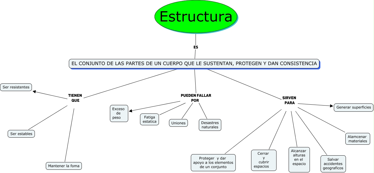 Este Cmap, tiene información relacionada con: ESTRUCTURA PARTE 1, Estructura ES EL CONJUNTO DE LAS PARTES DE UN CUERPO QUE LE SUSTENTAN, PROTEGEN Y DAN CONSISTENCIA, EL CONJUNTO DE LAS PARTES DE UN CUERPO QUE LE SUSTENTAN, PROTEGEN Y DAN CONSISTENCIA PUEDEN FALLAR POR Fatiga estatica, EL CONJUNTO DE LAS PARTES DE UN CUERPO QUE LE SUSTENTAN, PROTEGEN Y DAN CONSISTENCIA TIENEN QUE Ser resistentes, EL CONJUNTO DE LAS PARTES DE UN CUERPO QUE LE SUSTENTAN, PROTEGEN Y DAN CONSISTENCIA SIRVEN PARA Proteger y dar apoyo a los elementos de un conjunto, EL CONJUNTO DE LAS PARTES DE UN CUERPO QUE LE SUSTENTAN, PROTEGEN Y DAN CONSISTENCIA SIRVEN PARA Cerrar y cubrir espacios, EL CONJUNTO DE LAS PARTES DE UN CUERPO QUE LE SUSTENTAN, PROTEGEN Y DAN CONSISTENCIA SIRVEN PARA Alcanzar alturas en el espacio, EL CONJUNTO DE LAS PARTES DE UN CUERPO QUE LE SUSTENTAN, PROTEGEN Y DAN CONSISTENCIA SIRVEN PARA Salvar accidentes geograficos, EL CONJUNTO DE LAS PARTES DE UN CUERPO QUE LE SUSTENTAN, PROTEGEN Y DAN CONSISTENCIA SIRVEN PARA Generar superficies, EL CONJUNTO DE LAS PARTES DE UN CUERPO QUE LE SUSTENTAN, PROTEGEN Y DAN CONSISTENCIA PUEDEN FALLAR POR Exceso de peso, EL CONJUNTO DE LAS PARTES DE UN CUERPO QUE LE SUSTENTAN, PROTEGEN Y DAN CONSISTENCIA TIENEN QUE Mantener la foma, EL CONJUNTO DE LAS PARTES DE UN CUERPO QUE LE SUSTENTAN, PROTEGEN Y DAN CONSISTENCIA SIRVEN PARA Alamcenar materiales, EL CONJUNTO DE LAS PARTES DE UN CUERPO QUE LE SUSTENTAN, PROTEGEN Y DAN CONSISTENCIA TIENEN QUE Ser estables, EL CONJUNTO DE LAS PARTES DE UN CUERPO QUE LE SUSTENTAN, PROTEGEN Y DAN CONSISTENCIA PUEDEN FALLAR POR Desastres naturales, EL CONJUNTO DE LAS PARTES DE UN CUERPO QUE LE SUSTENTAN, PROTEGEN Y DAN CONSISTENCIA PUEDEN FALLAR POR Uniones
