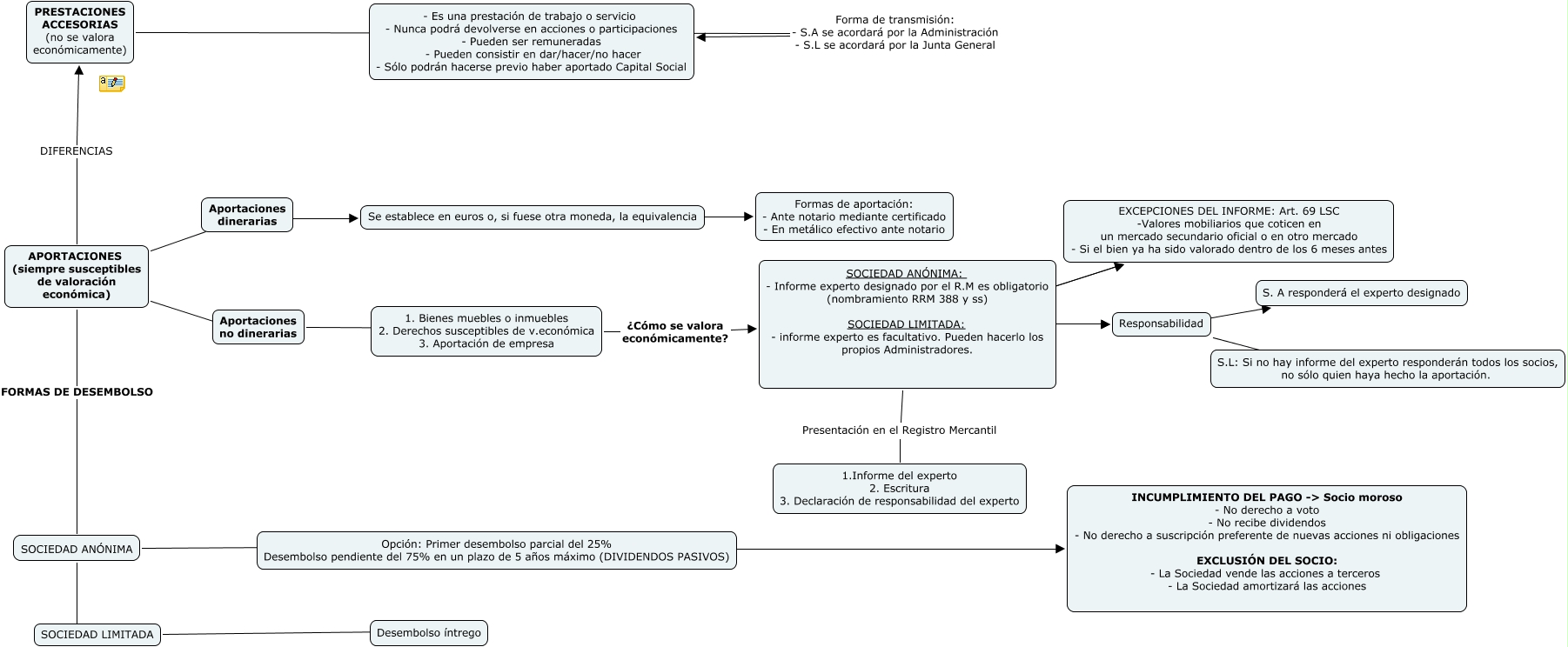 Aquest mapa conceptual conté informació relacionada amb: Sin Título 1, SOCIEDAD ANÓNIMA ???? Opción: Primer desembolso parcial del 25% Desembolso pendiente del 75% en un plazo de 5 años máximo (DIVIDENDOS PASIVOS), SOCIEDAD ANÓNIMA: - Informe experto designado por el R.M es obligatorio (nombramiento RRM 388 y ss) SOCIEDAD LIMITADA: - informe experto es facultativo. Pueden hacerlo los propios Administradores. ???? EXCEPCIONES DEL INFORME: Art. 69 LSC -Valores mobiliarios que coticen en un mercado secundario oficial o en otro mercado - Si el bien ya ha sido valorado dentro de los 6 meses antes, APORTACIONES (siempre susceptibles de valoración económica) ???? Aportaciones no dinerarias, Opción: Primer desembolso parcial del 25% Desembolso pendiente del 75% en un plazo de 5 años máximo (DIVIDENDOS PASIVOS) ???? INCUMPLIMIENTO DEL PAGO -> Socio moroso - No derecho a voto - No recibe dividendos - No derecho a suscripción preferente de nuevas acciones ni obligaciones EXCLUSIÓN DEL SOCIO: - La Sociedad vende las acciones a terceros - La Sociedad amortizará las acciones, APORTACIONES (siempre susceptibles de valoración económica) ???? Aportaciones dinerarias, Responsabilidad ???? S.L: Si no hay informe del experto responderán todos los socios, no sólo quien haya hecho la aportación., SOCIEDAD ANÓNIMA: - Informe experto designado por el R.M es obligatorio (nombramiento RRM 388 y ss) SOCIEDAD LIMITADA: - informe experto es facultativo. Pueden hacerlo los propios Administradores. Presentación en el Registro Mercantil 1.Informe del experto 2. Escritura 3. Declaración de responsabilidad del experto, SOCIEDAD ANÓNIMA: - Informe experto designado por el R.M es obligatorio (nombramiento RRM 388 y ss) SOCIEDAD LIMITADA: - informe experto es facultativo. Pueden hacerlo los propios Administradores. ???? Responsabilidad, APORTACIONES (siempre susceptibles de valoración económica) FORMAS DE DESEMBOLSO SOCIEDAD ANÓNIMA, SOCIEDAD ANÓNIMA: - Informe experto designado por el R.M es obligatorio (nombramiento RRM 388 y ss) SOCIEDAD LIMITADA: - informe experto es facultativo. Pueden hacerlo los propios Administradores. ???? EXCEPCIONES DEL INFORME: Art. 69 LSC -Valores mobiliarios que coticen en un mercado secundario oficial o en otro mercado - Si el bien ya ha sido valorado dentro de los 6 meses antes, SOCIEDAD ANÓNIMA: - Informe experto designado por el R.M es obligatorio (nombramiento RRM 388 y ss) SOCIEDAD LIMITADA: - informe experto es facultativo. Pueden hacerlo los propios Administradores. ???? Responsabilidad, Responsabilidad ???? S. A responderá el experto designado, SOCIEDAD ANÓNIMA ???? SOCIEDAD LIMITADA, Aportaciones dinerarias ???? Se establece en euros o, si fuese otra moneda, la equivalencia, PRESTACIONES ACCESORIAS (no se valora económicamente) Forma de transmisión: - S.A se acordará por la Administración - S.L se acordará por la Junta General - Es una prestación de trabajo o servicio - Nunca podrá devolverse en acciones o participaciones - Pueden ser remuneradas - Pueden consistir en dar/hacer/no hacer - Sólo podrán hacerse previo haber aportado Capital Social, Aportaciones no dinerarias ???? 1. Bienes muebles o inmuebles 2. Derechos susceptibles de v.económica 3. Aportación de empresa, APORTACIONES (siempre susceptibles de valoración económica) DIFERENCIAS PRESTACIONES ACCESORIAS (no se valora económicamente), 1. Bienes muebles o inmuebles 2. Derechos susceptibles de v.económica 3. Aportación de empresa ¿Cómo se valora económicamente? SOCIEDAD ANÓNIMA: - Informe experto designado por el R.M es obligatorio (nombramiento RRM 388 y ss) SOCIEDAD LIMITADA: - informe experto es facultativo. Pueden hacerlo los propios Administradores., Se establece en euros o, si fuese otra moneda, la equivalencia ???? Formas de aportación: - Ante notario mediante certificado - En metálico efectivo ante notario, SOCIEDAD LIMITADA ???? Desembolso íntrego