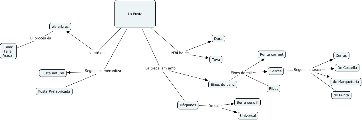 Aquest mapa conceptual conté informació relacionada amb: la fusta, La Fusta La treballam amb Màquines, La Fusta N'hi ha de Tova, La Fusta Segons es mecanitza Fusta natural, Eines de banc Eines de tall Punta corrent, Serres Segons la tasca Xerrac, La Fusta Segons es mecanitza Fusta Prefabricada, Màquines De tall Serra sens fí, els arbres El procés és Talar Tallar Asecar, Eines de banc Eines de tall Serres, Serres Segons la tasca de Marqueteria, La Fusta s'obté de els arbres, Màquines De tall Universal, La Fusta N'hi ha de Dura, Serres Segons la tasca de Punta, La Fusta La treballam amb Eines de banc, Serres Segons la tasca De Costella, Eines de banc Eines de tall Ribot