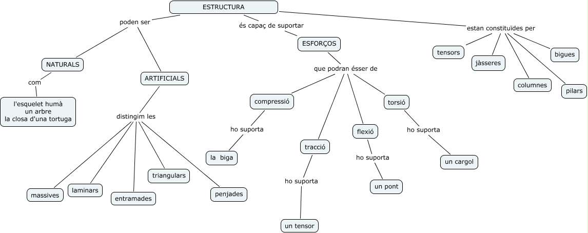 Aquest mapa conceptual conté informació relacionada amb: Estructures, ESTRUCTURA estan constituïdes per columnes, ARTIFICIALS distingim les laminars, ARTIFICIALS distingim les massives, ESTRUCTURA poden ser ARTIFICIALS, flexió ho suporta un pont, compressió ho suporta la biga, ARTIFICIALS distingim les entramades, ESTRUCTURA estan constituïdes per tensors, ARTIFICIALS distingim les triangulars, ESFORÇOS que podran ésser de tracció, ESTRUCTURA estan constituïdes per pilars, ESFORÇOS que podran ésser de torsió, NATURALS com l'esquelet humà un arbre la closa d'una tortuga, ARTIFICIALS distingim les penjades, ESFORÇOS que podran ésser de compressió, torsió ho suporta un cargol, ESTRUCTURA estan constituïdes per jàsseres, ESTRUCTURA poden ser NATURALS, ESFORÇOS que podran ésser de flexió, tracció ho suporta un tensor