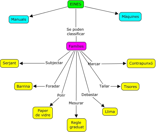 Aquest mapa conceptual conté informació relacionada amb: Eines, Famílies Marcar Contrapunxó, Famílies Debastar Llima, EINES Màquines, Famílies Subjectar Serjant, EINES Manuals, Famílies Mesurar Regle graduat, Famílies Foradar Barrina, Famílies Tallar Tisores, Famílies Polir Paper de vidre, Famílies Se poden classificar EINES