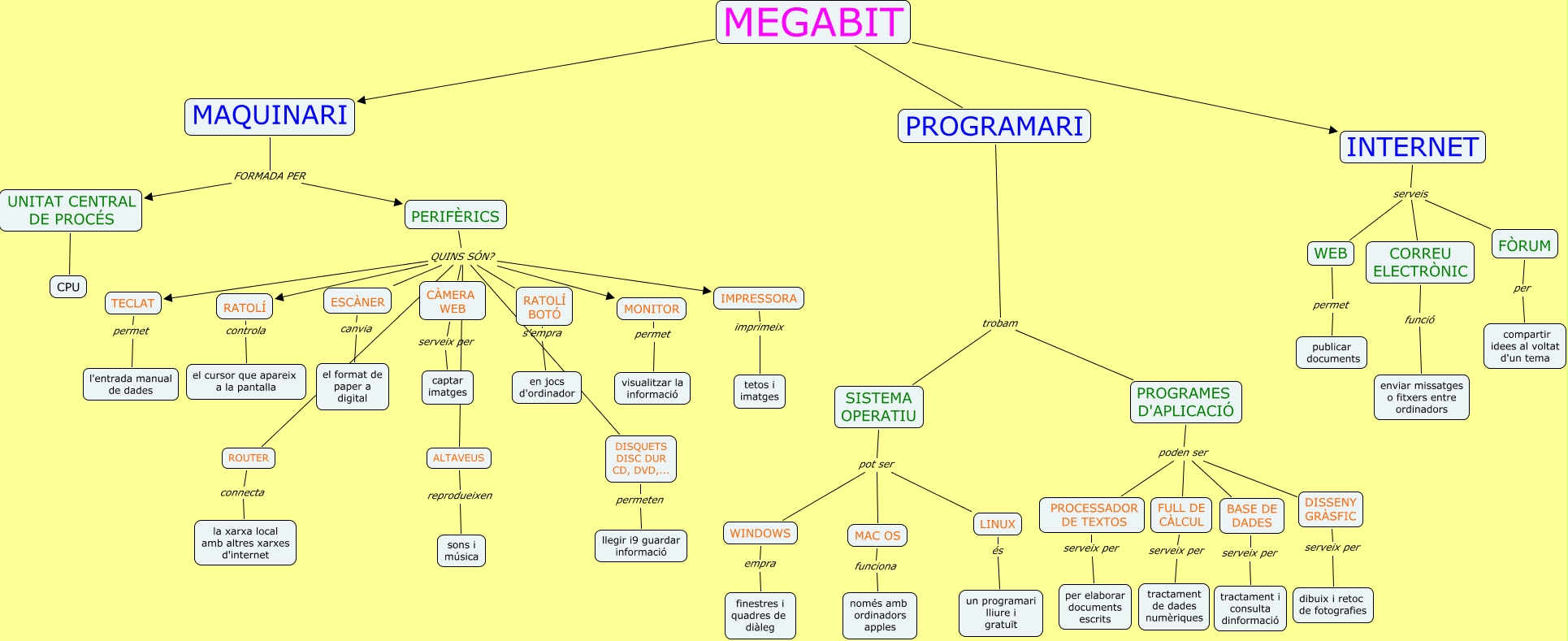 Aquest mapa conceptual conté informació relacionada amb: ACTIVITAT OBLIGATORIA 2 MEGABIT, CORREU ELECTRÒNIC funció enviar missatges o fitxers entre ordinadors, PERIFÈRICS QUINS SÓN? ALTAVEUS, SISTEMA OPERATIU pot ser WINDOWS, SISTEMA OPERATIU pot ser MAC OS, PROCESSADOR DE TEXTOS serveix per per elaborar documents escrits, LINUX és un programari lliure i gratuït, IMPRESSORA imprimeix tetos i imatges, PROGRAMES D'APLICACIÓ poden ser BASE DE DADES, PROGRAMES D'APLICACIÓ poden ser DISSENY GRÀSFIC, ALTAVEUS reprodueixen sons i música, FÒRUM per compartir idees al voltat d'un tema, ROUTER connecta la xarxa local amb altres xarxes d'internet, PERIFÈRICS QUINS SÓN? CÀMERA WEB, FULL DE CÀLCUL serveix per tractament de dades numèriques, INTERNET serveis CORREU ELECTRÒNIC, MAQUINARI FORMADA PER PERIFÈRICS, PROGRAMES D'APLICACIÓ poden ser FULL DE CÀLCUL, BASE DE DADES serveix per tractament i consulta dinformació, INTERNET serveis WEB, ESCÀNER canvia el format de paper a digital