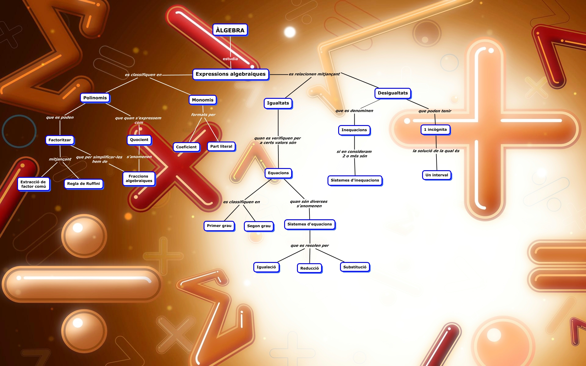 Aquest mapa conceptual conté informació relacionada amb: algebra2, Quocient s'anomenen Fraccions algebraiques, Inequacions si en consideram 2 o més són Sistemes d'inequacions, Fraccions algebraiques que per simplificar-les hem de Factoritzar, Equacions es classifiquen en Primer grau, Expressions algebraiques es classifiquen en Monomis, Sistemes d'equacions que es resolen per Igualació, Igualtats quan es verifiquen per a certs valors són Equacions, 1 incògnita la solució de la qual és Un interval, Polinomis que quan s'expressem com Quocient, Desigualtats que poden tenir 1 incògnita, Monomis formats per Part literal, Desigualtats que es denominen Inequacions, Monomis formats per Coeficient, Equacions quan són diverses s'anomenen Sistemes d'equacions, Desigualtats es relacionen mitjançant Igualtats, Factoritzar mitjançant Extracció de factor comú, Expressions algebraiques es relacionen mitjançant Igualtats, ÀLGEBRA estudia Expressions algebraiques, Equacions es classifiquen en Segon grau, Sistemes d'equacions que es resolen per Substitució