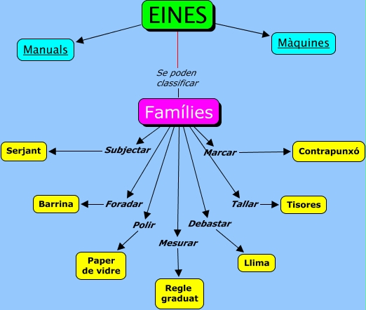 Aquest mapa conceptual conté informació relacionada amb: Eines, Famílies Debastar Llima, Famílies Marcar Contrapunxó, EINES Manuals, Famílies Subjectar Serjant, EINES Màquines, Famílies Tallar Tisores, Famílies Foradar Barrina, Famílies Mesurar Regle graduat, Famílies Se poden classificar EINES, Famílies Polir Paper de vidre