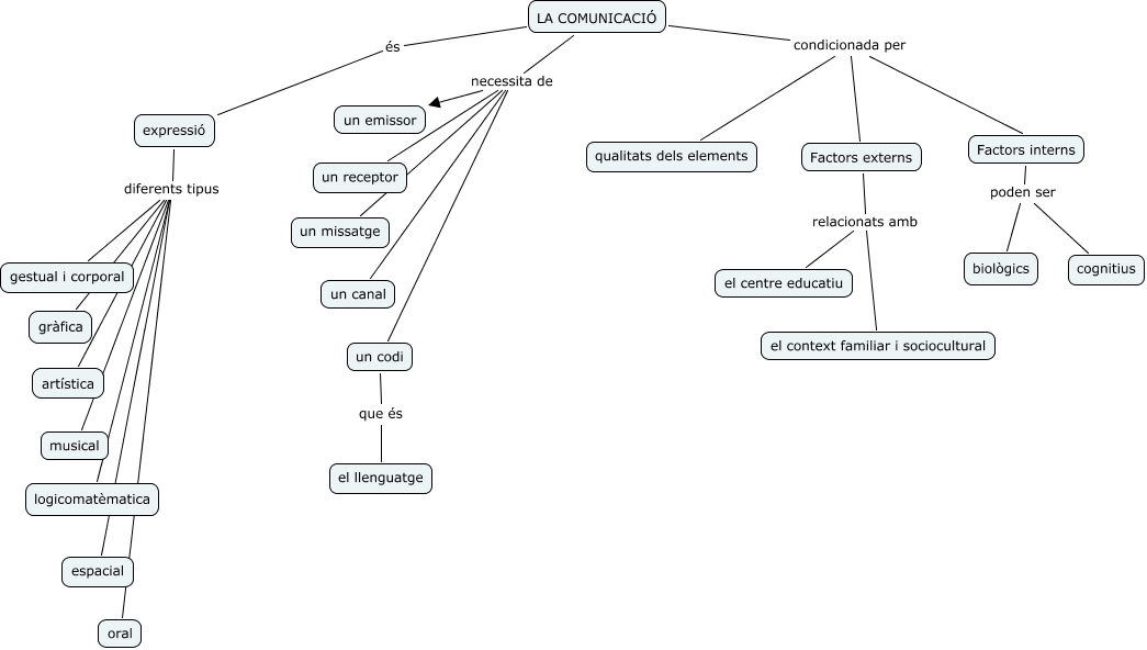 Aquest mapa conceptual conté informació relacionada amb: Activitat 1, un codi que és el llenguatge, Factors externs relacionats amb el centre educatiu, expressió diferents tipus gràfica, LA COMUNICACIÓ condicionada per qualitats dels elements, expressió diferents tipus gestual i corporal, expressió diferents tipus artística, LA COMUNICACIÓ necessita de un codi, Factors externs relacionats amb el context familiar i sociocultural, LA COMUNICACIÓ condicionada per Factors interns, expressió diferents tipus oral, LA COMUNICACIÓ necessita de un receptor, expressió diferents tipus logicomatèmatica, LA COMUNICACIÓ necessita de un canal, LA COMUNICACIÓ necessita de un missatge, expressió diferents tipus musical, LA COMUNICACIÓ condicionada per Factors externs, expressió diferents tipus espacial, Factors interns poden ser cognitius, LA COMUNICACIÓ necessita de un emissor, LA COMUNICACIÓ és expressió