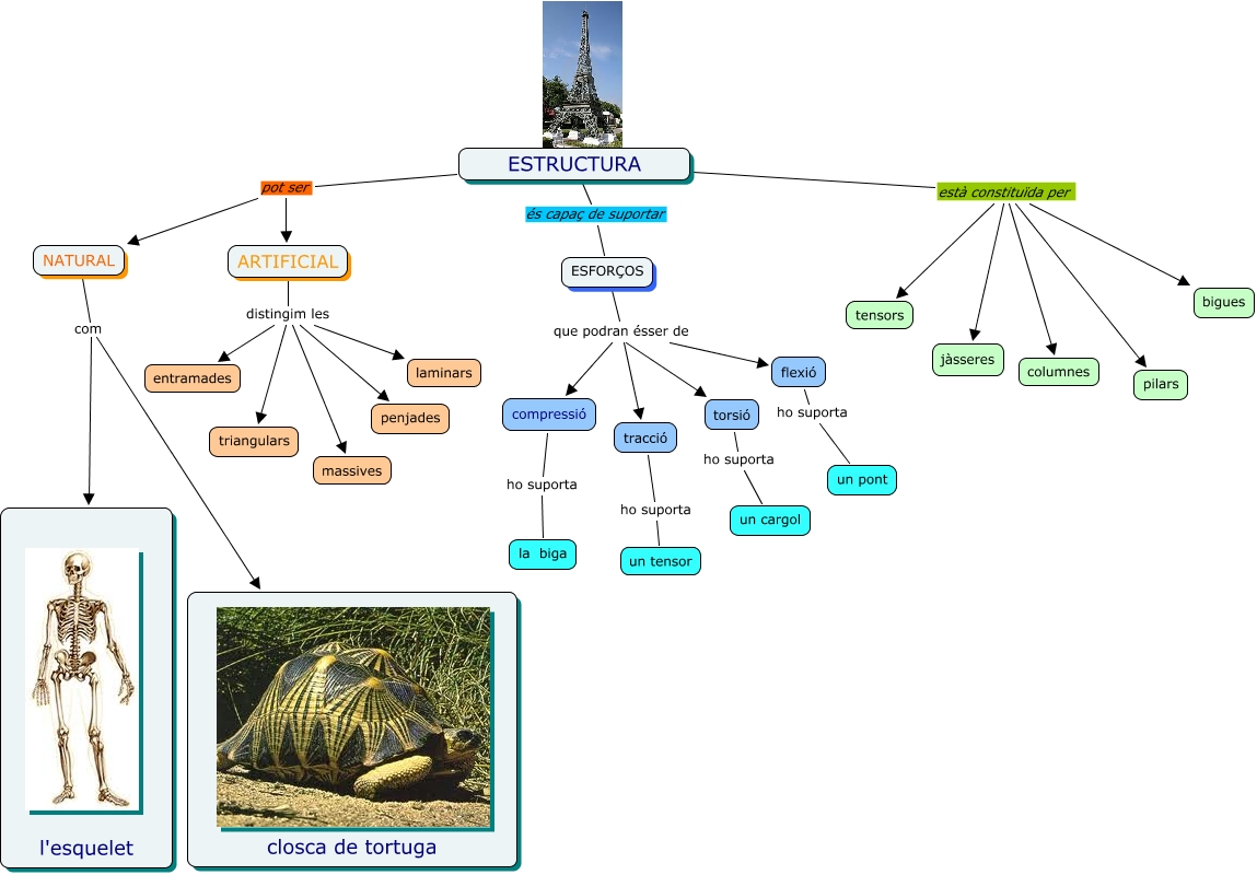 Aquest mapa conceptual conté informació relacionada amb: Estructures_2, NATURAL com closca de tortuga, ESTRUCTURA està constituïda per columnes, ARTIFICIAL distingim les laminars, ARTIFICIAL distingim les massives, ESTRUCTURA pot ser ARTIFICIAL, NATURAL com l'esquelet, flexió ho suporta un pont, compressió ho suporta la biga, ARTIFICIAL distingim les entramades, ESTRUCTURA està constituïda per tensors, ARTIFICIAL distingim les triangulars, ESFORÇOS que podran ésser de tracció, ESTRUCTURA està constituïda per pilars, ESFORÇOS que podran ésser de torsió, ARTIFICIAL distingim les penjades, ESFORÇOS que podran ésser de compressió, torsió ho suporta un cargol, ESTRUCTURA està constituïda per jàsseres, ESTRUCTURA pot ser NATURAL, ESFORÇOS que podran ésser de flexió
