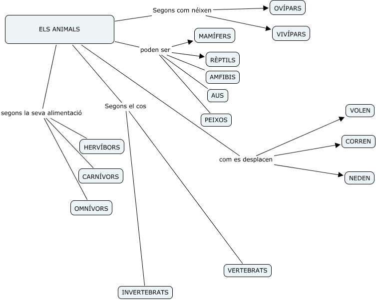 Aquest mapa conceptual conté informació relacionada amb: ELS ANIMALS, ELS ANIMALS Segons el cos INVERTEBRATS, ELS ANIMALS segons la seva alimentació HERVÍBORS, ELS ANIMALS poden ser RÈPTILS, ELS ANIMALS poden ser PEIXOS, ELS ANIMALS poden ser AUS, ELS ANIMALS com es desplacen VOLEN, ELS ANIMALS segons la seva alimentació OMNÍVORS, ELS ANIMALS Segons el cos VERTEBRATS, ELS ANIMALS com es desplacen NEDEN, ELS ANIMALS Segons com néixen VIVÍPARS, ELS ANIMALS Segons com néixen OVÍPARS, ELS ANIMALS segons la seva alimentació CARNÍVORS, ELS ANIMALS poden ser AMFIBIS, ELS ANIMALS com es desplacen CORREN, ELS ANIMALS poden ser MAMÍFERS