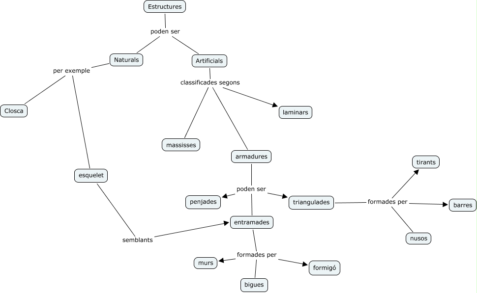 Aquest mapa conceptual conté informació relacionada amb: estructures, armadures poden ser penjades, esquelet semblants entramades, entramades formades per murs, triangulades formades per nusos, entramades formades per formigó, Artificials classificades segons laminars, triangulades formades per barres, Artificials classificades segons massisses, Estructures poden ser Naturals, Estructures poden ser Artificials, Naturals per exemple Closca, armadures poden ser triangulades, armadures poden ser entramades, Naturals per exemple esquelet, triangulades formades per tirants, Artificials classificades segons armadures, entramades formades per bigues