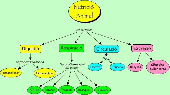 Aquest mapa conceptual conté informació relacionada amb: nutrici¢ animal, Respiració Tipus d'intercanvi de gasos Pulmonar, Circulació Tipus Oberta, Excreció Glàndules Sudoripares, Excreció Ronyons, Respiració Tipus d'intercanvi de gasos Cutànea, Respiració Tipus d'intercanvi de gasos Traqueal, Respiració Tipus d'intercanvi de gasos Difusió, Respiració Tipus d'intercanvi de gasos Branquial, Nutrició Animal és divideix Digestió, Digestió se pot classificar en intracel·lular, Nutrició Animal és divideix Respiració, Circulació Tipus Tancada, Nutrició Animal és divideix Excreció, Digestió se pot classificar en Extracel·lular, Nutrició Animal és divideix Circulació