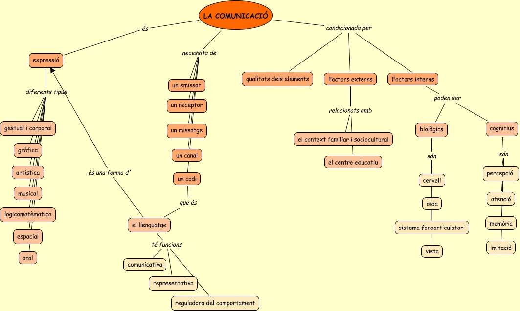 Aquest mapa conceptual conté informació relacionada amb: Activitat 2, LA COMUNICACIÓ necessita de un receptor, expressió diferents tipus gràfica, cognitius són percepció, Factors externs relacionats amb el context familiar i sociocultural, expressió diferents tipus artística, cognitius són memòria, un codi que és el llenguatge, LA COMUNICACIÓ condicionada per Factors interns, cognitius són imitació, biològics són sistema fonoarticulatori, el llenguatge té funcions reguladora del comportament, Factors interns poden ser cognitius, expressió diferents tipus musical, LA COMUNICACIÓ necessita de un codi, expressió diferents tipus oral, cognitius són atenció, el llenguatge té funcions representativa, biològics són cervell, LA COMUNICACIÓ necessita de un canal, LA COMUNICACIÓ condicionada per qualitats dels elements