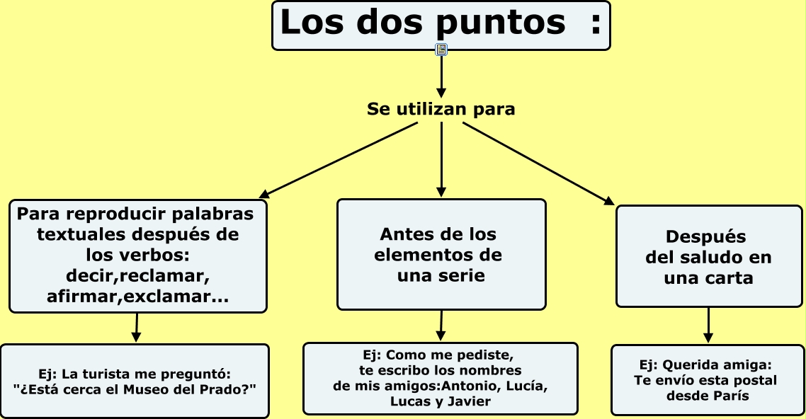 Este Cmap, tiene información relacionada con: Los dos puntos, Los dos puntos : Se utilizan para Antes de los elementos de una serie, Para reproducir palabras textuales después de los verbos: decir,reclamar, afirmar,exclamar... Ej: La turista me preguntó: "¿Está cerca el Museo del Prado?", Los dos puntos : Se utilizan para Para reproducir palabras textuales después de los verbos: decir,reclamar, afirmar,exclamar..., Después del saludo en una carta Ej: Querida amiga: Te envío esta postal desde París, Antes de los elementos de una serie Ej: Como me pediste, te escribo los nombres de mis amigos:Antonio, Lucía, Lucas y Javier, Los dos puntos : Se utilizan para Después del saludo en una carta