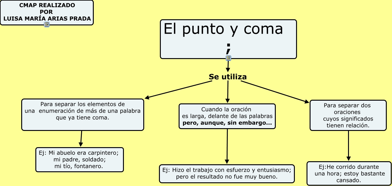 Este Cmap, tiene información relacionada con: El punto y coma, El punto y coma ; Se utiliza Cuando la oración es larga, delante de las palabras pero, aunque, sin embargo..., Para separar los elementos de una enumeración de más de una palabra que ya tiene coma. Ej: Mi abuelo era carpintero; mi padre, soldado; mi tío, fontanero., Para separar dos oraciones cuyos significados tienen relación. Ej:He corrido durante una hora; estoy bastante cansado., El punto y coma ; Se utiliza Para separar dos oraciones cuyos significados tienen relación., El punto y coma ; Se utiliza Para separar los elementos de una enumeración de más de una palabra que ya tiene coma., Cuando la oración es larga, delante de las palabras pero, aunque, sin embargo... Ej: Hizo el trabajo con esfuerzo y entusiasmo; pero el resultado no fue muy bueno.