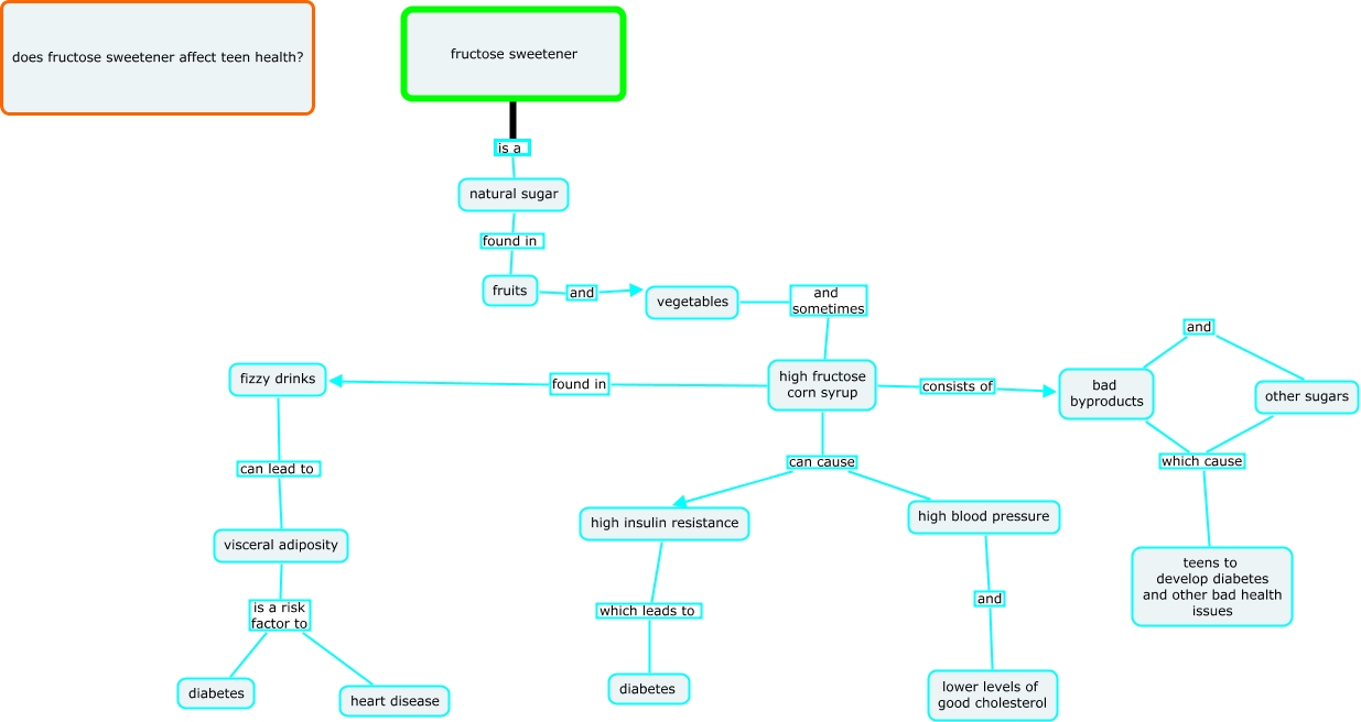 This Concept Map, created with IHMC CmapTools, has information related to: High Frutose Max Amendolara, fizzy drinks can lead to visceral adiposity, bad byproducts and other sugars, fruits and vegetables, vegetables and sometimes high fructose corn syrup, fructose sweetener is a natural sugar, high insulin resistance which leads to diabetes, high fructose corn syrup can cause high insulin resistance, high fructose corn syrup found in fizzy drinks, bad byproducts which cause teens to develop diabetes and other bad health issues, high fructose corn syrup consists of bad byproducts, high blood pressure and lower levels of good cholesterol, high fructose corn syrup can cause high blood pressure, visceral adiposity is a risk factor to heart disease, other sugars which cause teens to develop diabetes and other bad health issues, visceral adiposity is a risk factor to diabetes, natural sugar found in fruits