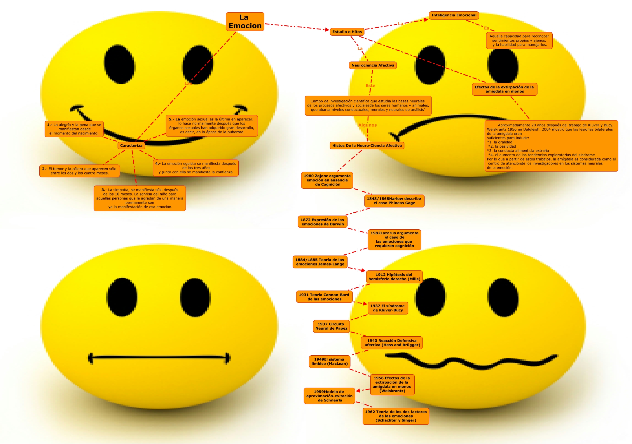 Este Cmap, tiene información relacionada con: Emocion, Caracteriza ???? 2.- El temor y la cólera que aparecen sólo entre los dos y los cuatro meses., 1931 Teoría Cannon-Bard de las emociones 1937 El síndrome de Klüver-Bucy, Efectos de la extirpación de la amígdala en monos Aproximadamente 20 años después del trabajo de Klüver y Bucy, Weiskrantz 1956 en Dalgleish, 2004 mostró que las lesiones bilaterales de la amígdala eran suficientes para inducir: *1. la oralidad *2. la pasividad *3. la conducta alimenticia extraña *4. el aumento de las tendencias exploratorias del síndrome Por lo que a partir de estos trabajos, la amígdala es considerada como el centro de atenciónde los investigadores en los sistemas neurales de la emoción., Caracteriza ???? 5.- La emoción sexual es la última en aparecer, lo hace normalmente después que los órganos sexuales han adquirido gran desarrollo, es decir, en la época de la pubertad, 1959 Modelo de aproximación-evitación de Schneirla 1962 Teoría de los dos factores de las emociones (Schachter y Singer), Caracteriza ???? 3.- La simpatía, se manifiesta sólo después de los 10 meses. La sonrisa del niño para aquellas personas que le agradan de una manera permanente son ya la manifestación de esa emoción., Caracteriza ???? 4.- La emoción egoísta se manifiesta después de los tres años y junto con ella se manifiesta la confianza., 1956 Efectos de la extirpación de la amígdala en monos (Weiskrantz) 1959 Modelo de aproximación-evitación de Schneirla, Inteligencia Emocional Es Aquella capacidad para reconocer sentimientos propios y ajenos, y la habilidad para manejarlos., 1937 El síndrome de Klüver-Bucy 1937 Circuito Neural de Papez, Neurociencia Afectiva Este Campo de investigación científica que estudia las bases neurales de los procesos afectivos y socialesde los seres humanos y animales, que abarca niveles conductuales, morales y neurales de análisis", 1949 El sistema límbico (MacLean) 1956 Efectos de la extirpación de la amígdala en monos (Weiskrantz), La Emocion Estudio e Hitos, Estudio e Hitos La Neurociencia Afectiva, Histos De la Neuro-Ciencia Afectiva 1980 Zajonc argumenta emoción en ausencia de Cognición, Caracteriza ???? 1.- La alegría y la pena que se manifiestan desde el momento del nacimiento., Estudio e Hitos La Inteligencia Emocional, 1912 Hipótesis del hemisferio derecho (Mills) 1931 Teoría Cannon-Bard de las emociones, 1937 Circuito Neural de Papez 1943 Reacción Defensiva afectiva (Hess and Brügger), La Emocion Las Caracteriza