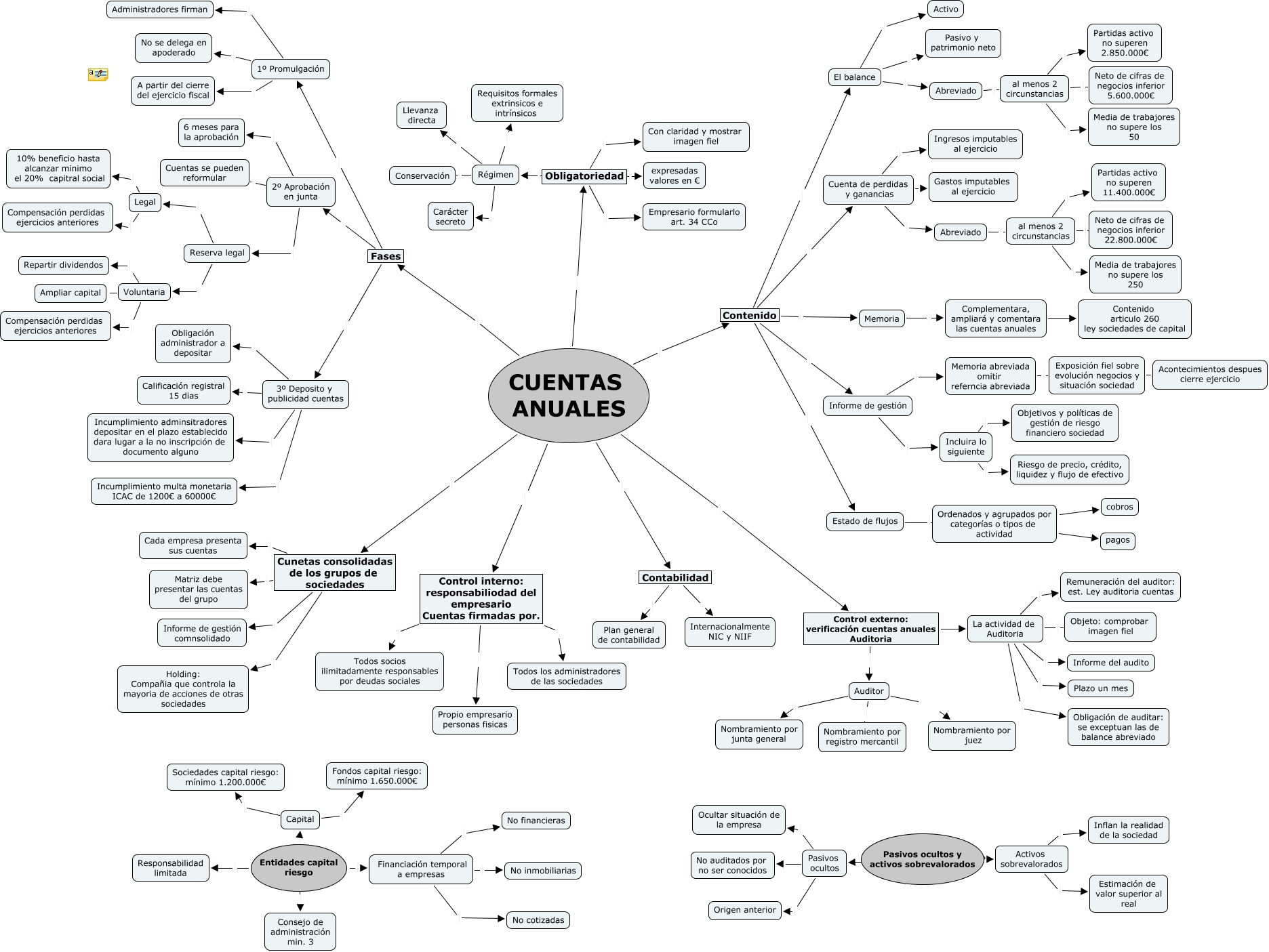 Aquest mapa conceptual conté informació relacionada amb: Escenario 3 Cuentas anuales, Estado de flujos Ordenados y agrupados por categorías o tipos de actividad, El balance Activo, La actividad de Auditoria Remuneración del auditor: est. Ley auditoria cuentas, 2º Aprobación en junta Cuentas se pueden reformular, 3º Deposito y publicidad cuentas Calificación registral 15 dias, Incluira lo siguiente Objetivos y políticas de gestión de riesgo financiero sociedad, Entidades capital riesgo Consejo de administración min. 3, La actividad de Auditoria Objeto: comprobar imagen fiel, Cunetas consolidadas de los grupos de sociedades Matriz debe presentar las cuentas del grupo, Control interno: responsabiliodad del empresario Cuentas firmadas por. Todos los administradores de las sociedades, Legal 10% beneficio hasta alcanzar minimo el 20% capitral social, CUENTAS ANUALES Contenido, Control interno: responsabiliodad del empresario Cuentas firmadas por. Todos socios ilimitadamente responsables por deudas sociales, Cunetas consolidadas de los grupos de sociedades Holding: Compañia que controla la mayoria de acciones de otras sociedades, al menos 2 circunstancias Media de trabajores no supere los 250, Ordenados y agrupados por categorías o tipos de actividad pagos, Cunetas consolidadas de los grupos de sociedades Cada empresa presenta sus cuentas, CUENTAS ANUALES Control externo: verificación cuentas anuales Auditoria, La actividad de Auditoria Obligación de auditar: se exceptuan las de balance abreviado, Financiación temporal a empresas No financieras