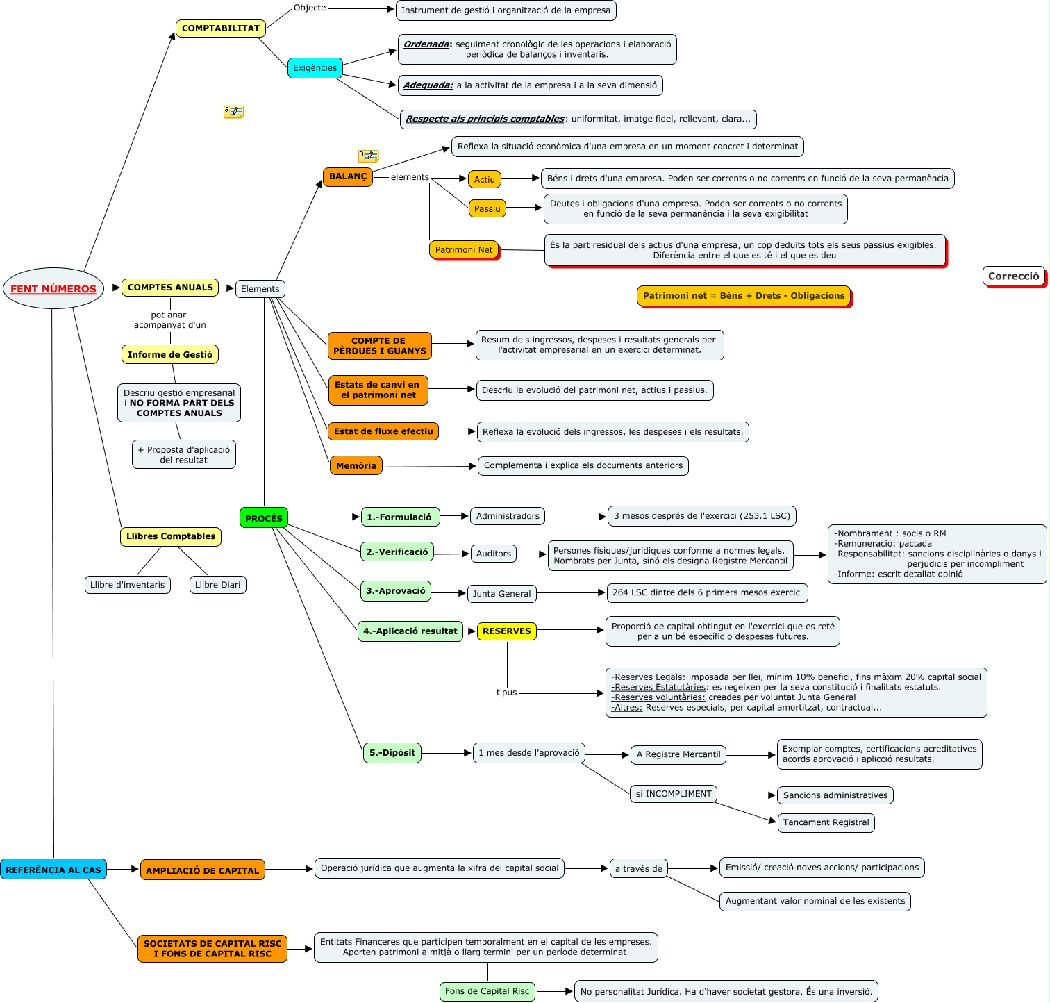 Este Cmap, tiene información relacionada con: Supòsit 3 - Fent números (corregit), a través de ???? Emissió/ creació noves accions/ participacions, Elements ???? BALANÇ, 5.-Dipòsit ???? 1 mes desde l'aprovació, FENT NÚMEROS ???? REFERÈNCIA AL CAS, PROCÉS ???? 1.-Formulació, COMPTABILITAT Objecte Instrument de gestió i organització de la empresa, BALANÇ elements Patrimoni Net, Patrimoni Net ???? És la part residual dels actius d'una empresa, un cop deduïts tots els seus passius exigibles. Diferència entre el que es té i el que es deu, si INCOMPLIMENT ???? Sancions administratives, BALANÇ ???? Reflexa la situació econòmica d'una empresa en un moment concret i determinat, Operació jurídica que augmenta la xifra del capital social ???? a través de, Elements ???? Estats de canvi en el patrimoni net, Fons de Capital Risc ???? No personalitat Jurídica. Ha d'haver societat gestora. És una inversió., COMPTE DE PÈRDUES I GUANYS ???? Resum dels ingressos, despeses i resultats generals per l'activitat empresarial en un exercici determinat., Elements ???? Estat de fluxe efectiu, Elements ???? Memòria, COMPTES ANUALS pot anar acompanyat d'un Informe de Gestió, COMPTABILITAT Exigències, Descriu gestió empresarial i NO FORMA PART DELS COMPTES ANUALS ???? + Proposta d'aplicació del resultat, Llibres Comptables ???? Llibre Diari