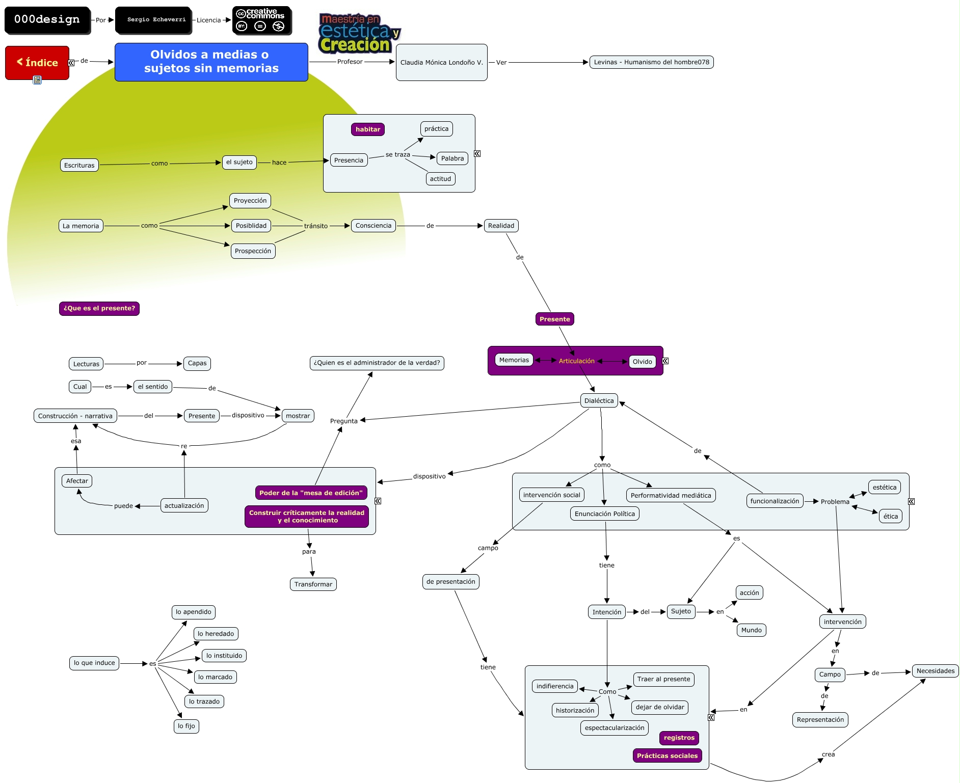 Este Cmap, tiene información relacionada con: Olvidos a medias o sujetos sin memorias, lo que induce es lo heredado, Campo de Necesidades, Intención Como indifierencia, funcionalización Problema intervención, Cual es el sentido, Campo de Representación, Intención Como espectacularización, Afectar esa Construcción - narrativa, 000design Por Sergio Echeverri, lo que induce es lo fijo, funcionalización Problema ética, Presencia se traza Palabra, Performatividad mediática es intervención, el sujeto hace Presencia, Sujeto en acción, intervención en Campo, Dialéctica Pregunta ¿Quien es el administrador de la verdad?, de presentación tiene Practicas sociales, intervención en Practicas sociales, Practicas sociales crea Necesidades