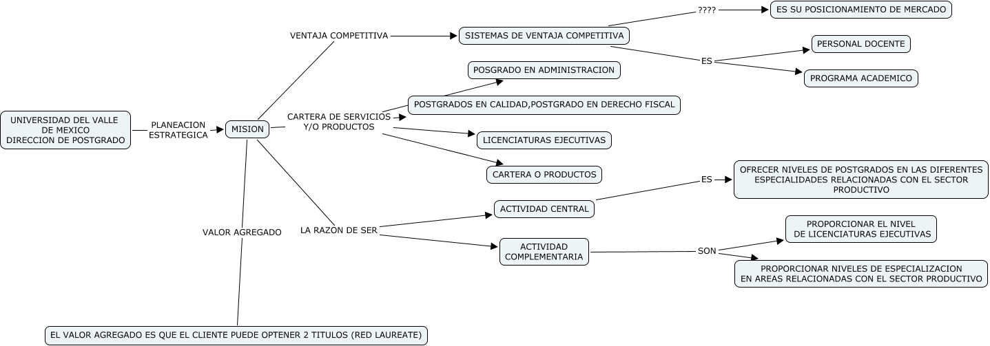 Este Cmap, tiene información relacionada con: MAPA CONCEPTUAL ADMINISTRACION ESTRATEGICA, SISTEMAS DE VENTAJA COMPETITIVA ???? ES SU POSICIONAMIENTO DE MERCADO, MISION CARTERA DE SERVICIOS Y/O PRODUCTOS CARTERA O PRODUCTOS, SISTEMAS DE VENTAJA COMPETITIVA ES PROGRAMA ACADEMICO, MISION CARTERA DE SERVICIOS Y/O PRODUCTOS POSGRADO EN ADMINISTRACION, MISION CARTERA DE SERVICIOS Y/O PRODUCTOS LICENCIATURAS EJECUTIVAS, SISTEMAS DE VENTAJA COMPETITIVA ES PERSONAL DOCENTE, MISION LA RAZON DE SER ACTIVIDAD COMPLEMENTARIA, MISION VENTAJA COMPETITIVA SISTEMAS DE VENTAJA COMPETITIVA, MISION VALOR AGREGADO EL VALOR AGREGADO ES QUE EL CLIENTE PUEDE OPTENER 2 TITULOS (RED LAUREATE), MISION CARTERA DE SERVICIOS Y/O PRODUCTOS POSTGRADOS EN CALIDAD,POSTGRADO EN DERECHO FISCAL, ACTIVIDAD CENTRAL ES OFRECER NIVELES DE POSTGRADOS EN LAS DIFERENTES ESPECIALIDADES RELACIONADAS CON EL SECTOR PRODUCTIVO, UNIVERSIDAD DEL VALLE DE MEXICO DIRECCION DE POSTGRADO PLANEACION ESTRATEGICA MISION, ACTIVIDAD COMPLEMENTARIA SON PROPORCIONAR NIVELES DE ESPECIALIZACION EN AREAS RELACIONADAS CON EL SECTOR PRODUCTIVO, ACTIVIDAD COMPLEMENTARIA SON PROPORCIONAR EL NIVEL DE LICENCIATURAS EJECUTIVAS, MISION LA RAZON DE SER ACTIVIDAD CENTRAL