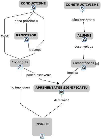 Este Cmap, tiene información relacionada con: CMAP teorias pedagógicas, CONSTRUCTIVISME dóna prioritat a ALUMNE, ALUMNE desenvolupa Competències, Competències conjunt de Habilitats, CONDUCTISME acota Continguts, Competències conjunt de Actituds i valors, CONDUCTISME trasmet Continguts, Continguts no impliquen INSIGHT, Continguts poden esdevenir APRENENTATGE SIGNIFICATIU, Competències implica APRENENTATGE SIGNIFICATIU, CONDUCTISME dona prioritat a PROFESSOR, APRENENTATGE SIGNIFICATIU determina INSIGHT, PROFESSOR trasmet Continguts, Competències conjunt de Coneixements
