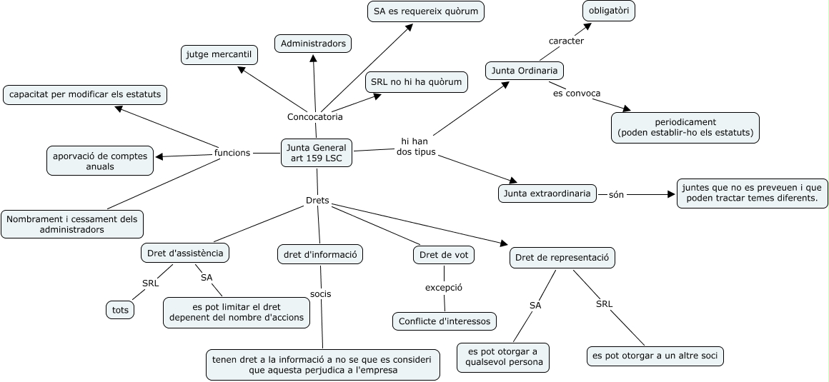 Aquest mapa conceptual conté informació relacionada amb: Cas 4 Fiasco a l'Empòrium, Junta General art 159 LSC Concocatoria SRL no hi ha quòrum, Junta extraordinaria són juntes que no es preveuen i que poden tractar temes diferents., Junta General art 159 LSC Drets Dret d'assistència, Junta General art 159 LSC Drets Dret de representació, dret d'informació socis tenen dret a la informació a no se que es consideri que aquesta perjudica a l'empresa, Junta General art 159 LSC Concocatoria Administradors, Junta General art 159 LSC funcions aporvació de comptes anuals, Junta General art 159 LSC Concocatoria SA es requereix quòrum, Dret de representació SRL es pot otorgar a un altre soci, Dret de representació SA es pot otorgar a qualsevol persona, Junta General art 159 LSC funcions capacitat per modificar els estatuts, Junta General art 159 LSC Concocatoria jutge mercantil, Junta General art 159 LSC hi han dos tipus Junta Ordinaria, Dret d'assistència SRL tots, Junta General art 159 LSC Drets dret d'informació, Junta Ordinaria es convoca periodicament (poden establir-ho els estatuts), Dret de vot excepció Conflicte d'interessos, Junta General art 159 LSC funcions Nombrament i cessament dels administradors, Junta Ordinaria caracter obligatòri, Junta General art 159 LSC hi han dos tipus Junta extraordinaria
