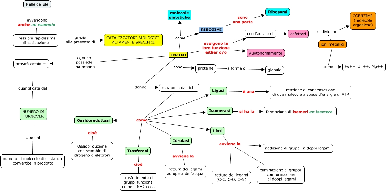 Questa Cmap, creata con IHMC CmapTools, contiene informazioni relative a: domanda 7 modulo enzimi 2, RIBOZIMI sono una parte Ribosomi, Isomerasi si ha la formazione di isomeri un isomero, Ossidoreduttasi cioè Ossidoriduzione con scambio di idrogeno o elettroni, CATALIZZATORI BIOLOGICI ALTAMENTE SPECIFICI come molecole sintetiche, Liasi avviene la rottura dei legami (C-C, C-O, C-N), cofattori si dividono in COENZIMI (molecole organiche), ENZIMI danno reazioni catalitiche, reazioni rapidissime di ossidazione grazie alla presenza di CATALIZZATORI BIOLOGICI ALTAMENTE SPECIFICI, CATALIZZATORI BIOLOGICI ALTAMENTE SPECIFICI come RIBOZIMI, reazioni catalitiche come Trasferasi, Nelle cellule avvengono anche ad esempio reazioni rapidissime di ossidazione, Idrolasi avviene la rottura dei legami ad opera dell'acqua, CATALIZZATORI BIOLOGICI ALTAMENTE SPECIFICI come ENZIMI, Liasi avviene la eliminazione di gruppi con formazione di doppi legami, ioni metallici come Fe++. Zn++, Mg++, attività catalitica quantificata dal NUMERO DI TURNOVER, proteine a forma di globulo, reazioni catalitiche come Ligasi, reazioni catalitiche come Ossidoreduttasi, Trasferasi cioè trasferimento di gruppi funzionali come: -NH2 ecc..