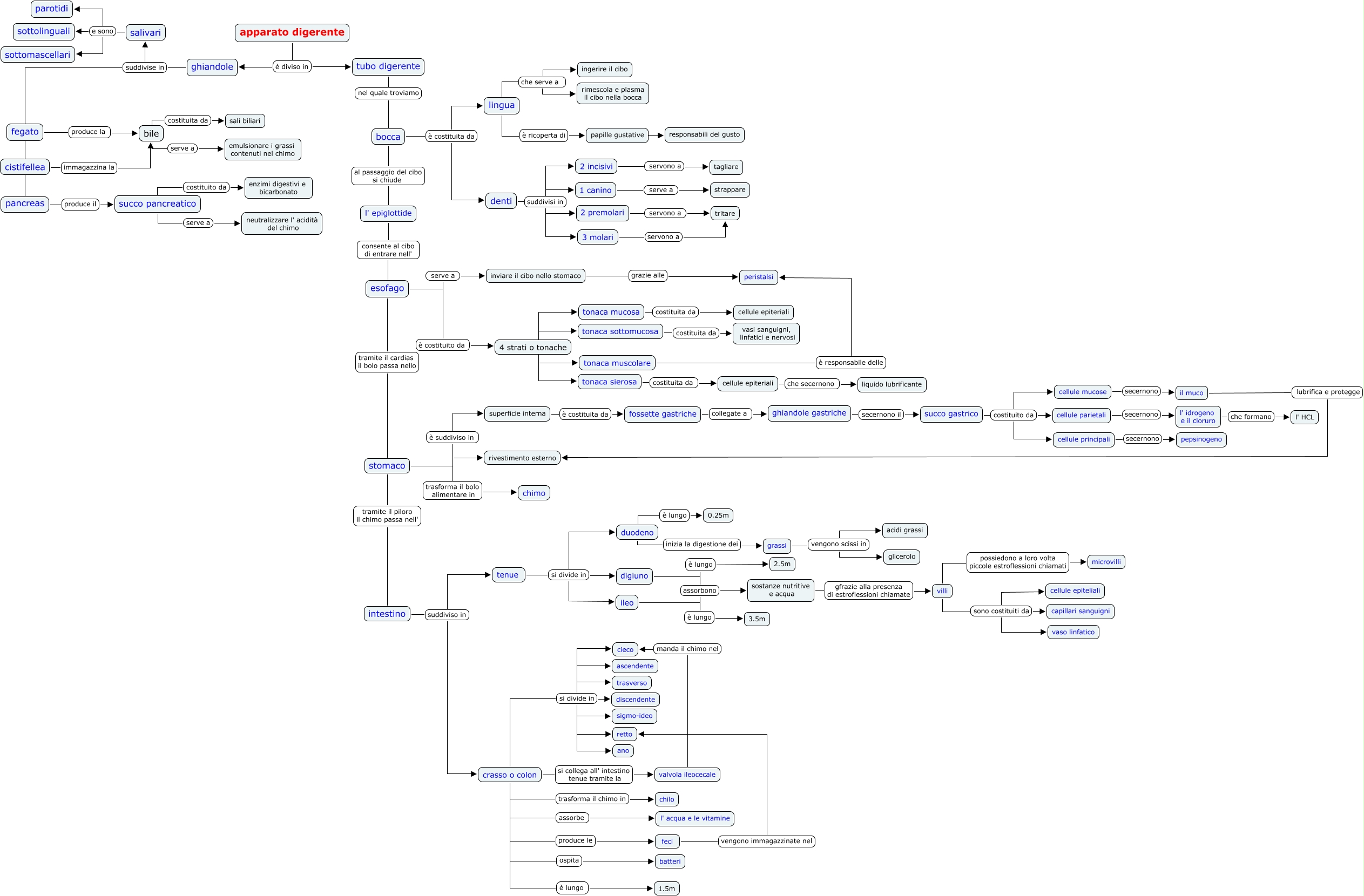 Questa Cmap, creata con IHMC CmapTools, contiene informazioni relative a: Mappa Apparato Digerente-DiVozzoK, esofago tramite il cardias il bolo passa nello stomaco, papille gustative ???? responsabili del gusto, denti suddivisi in 2 incisivi, bile serve a emulsionare i grassi contenuti nel chimo, succo pancreatico serve a neutralizzare l' acidità del chimo, ghiandole suddivise in fegato, salivari e sono parotidi, cellule mucose secernono il muco, lingua che serve a rimescola e plasma il cibo nella bocca, denti suddivisi in 2 premolari, lingua che serve a ingerire il cibo, ghiandole suddivise in salivari, villi sono costituiti da capillari sanguigni, tenue si divide in duodeno, 4 strati o tonache . tonaca sierosa, salivari e sono sottolinguali, tonaca mucosa costituita da cellule epiteriali, 4 strati o tonache . tonaca sottomucosa, sostanze nutritive e acqua gfrazie alla presenza di estroflessioni chiamate villi, grassi vengono scissi in glicerolo