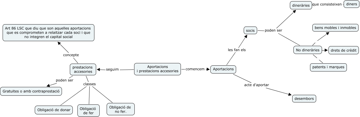 Aquest mapa conceptual conté informació relacionada amb: C map Cas 2 Comencem a rutllar, Aportacions i prestacions accesories seguim prestacions accesories, prestacions accesories classes Obligació de fer, Aportacions acte d'aportar desembors, dineràries que consisteixen diners, No dineràries drets de crèdit, No dineràries bens mobles i inmobles, prestacions accesories poden ser Gratuites o amb contraprestació, prestacions accesories classes Obligació de donar, socis poden ser dineràries, prestacions accesories concepte Art 86 LSC que diu que son aquelles aportacions que es comprometen a relaitzar cada soci i que no integren el capital social, prestacions accesories classes Obligació de no fer., Aportacions les fan els socis, socis poden ser No dineràries, No dineràries patents i marques, Aportacions i prestacions accesories comencem Aportacions