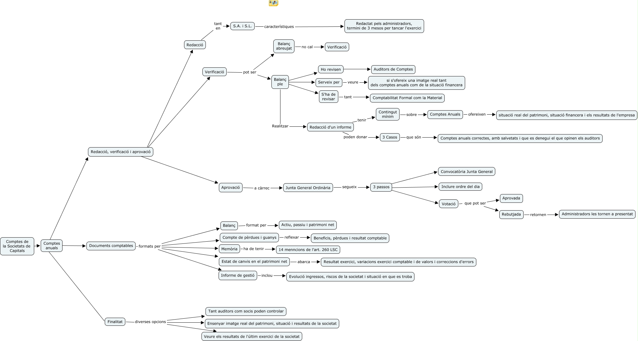 Este Cmap, tiene información relacionada con: Cmap 3, S.A. i S.L. característiques Redactat pels administradors, termini de 3 mesos per tancar l'exercici, Redacció tant en S.A. i S.L., Documents comptables formats per Compte de pèrdues i guanys, Verificació pot ser Balanç ple, Rebutjada retornen Administradors les tornen a presentat, Balanç ple ???? Serveix per, Documents comptables formats per Balanç, 3 passos ???? Inclure ordre del dia, Comptes anuals ???? Finalitat, Finalitat diverses opcions Ensenyar imatge real del patrimoni, situació i resultats de la societat, 3 Casos que són Comptes anuals correctes, amb salvetats i que es denegui el que opinen els auditors, Serveix per veure si s'ofereix una imatge real tant dels comptes anuals com de la situació financera, Comptes de la Societats de Capitals ???? Comptes anuals, Votació que pot ser Aprovada, Redacció d'un informe tenir Contingut mínim, Documents comptables formats per Informe de gestió, 3 passos ???? Votació, Verificació pot ser Balanç abreujat, Ho revisen ???? Auditors de Comptes, Comptes anuals ???? Redacció, verificació i aprovació