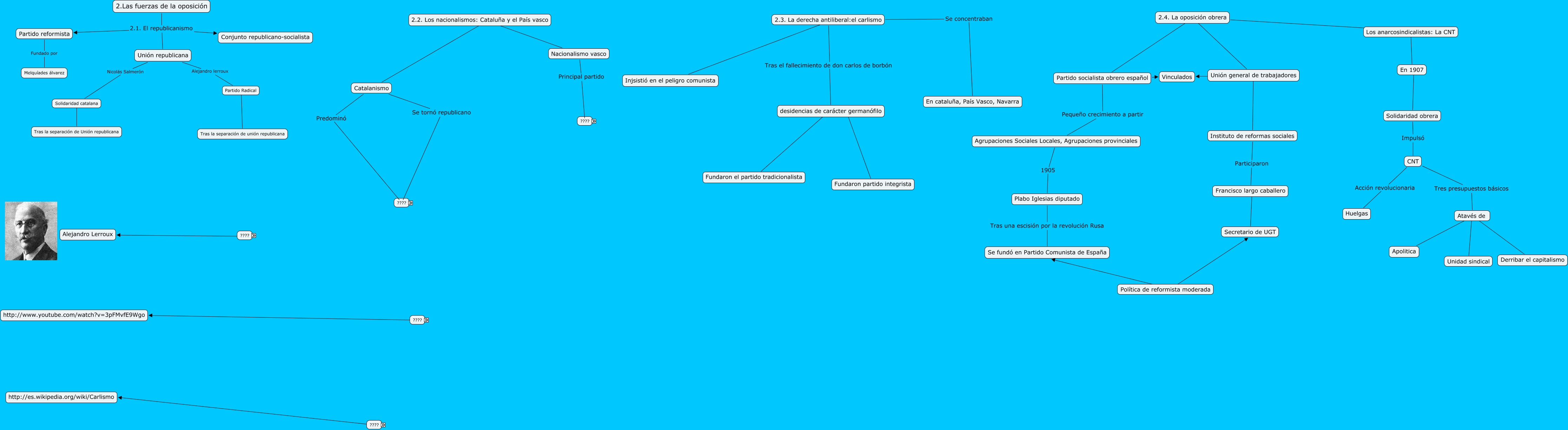 Este Cmap, tiene información relacionada con: tema 11 pnt 2, 2.Las fuerzas de la oposición 2.1. El republicanismo Unión republicana, A lo largo del primer tercio del siglo XX surgieron seformó Solidaridad Catalana, 2.4. La oposición obrera ???? Unión general de trabajadores, ???? ???? http://es.wikipedia.org/wiki/Carlismo, Partido reformista Fundado por Melquíades álvarez, Política de reformista moderada ???? Secretario de UGT, ???? ???? Alejandro Lerroux, A lo largo del primer tercio del siglo XX surgieron seformó Estat Catalá, Partido socialista obrero español Pequeño crecimiento a partir Agrupaciones Sociales Locales, Agrupaciones provinciales, Catalanismo Predominó La Lliga Regionalista, Unión republicana Alejandro lerroux Partido Radical, PNV esiciones Grupo aberri, 2.Las fuerzas de la oposición 2.1. El republicanismo Conjunto republicano-socialista, 2.Las fuerzas de la oposición 2.1. El republicanismo Partido reformista, Partido socialista obrero español ???? Vinculados, 2.3. La derecha antiliberal:el carlismo Tras el fallecimiento de don carlos de borbón desidencias de carácter germanófilo, La Lliga Regionalista En 1931 fue derrotado por Esquerra Republicana de Catalunya, PNV Creó su propio sindicato Solidaridad de obreros vascos, Solidaridad catalana ???? Tras la separación de Unión republicana, desidencias de carácter germanófilo ???? Fundaron el partido tradicionalista