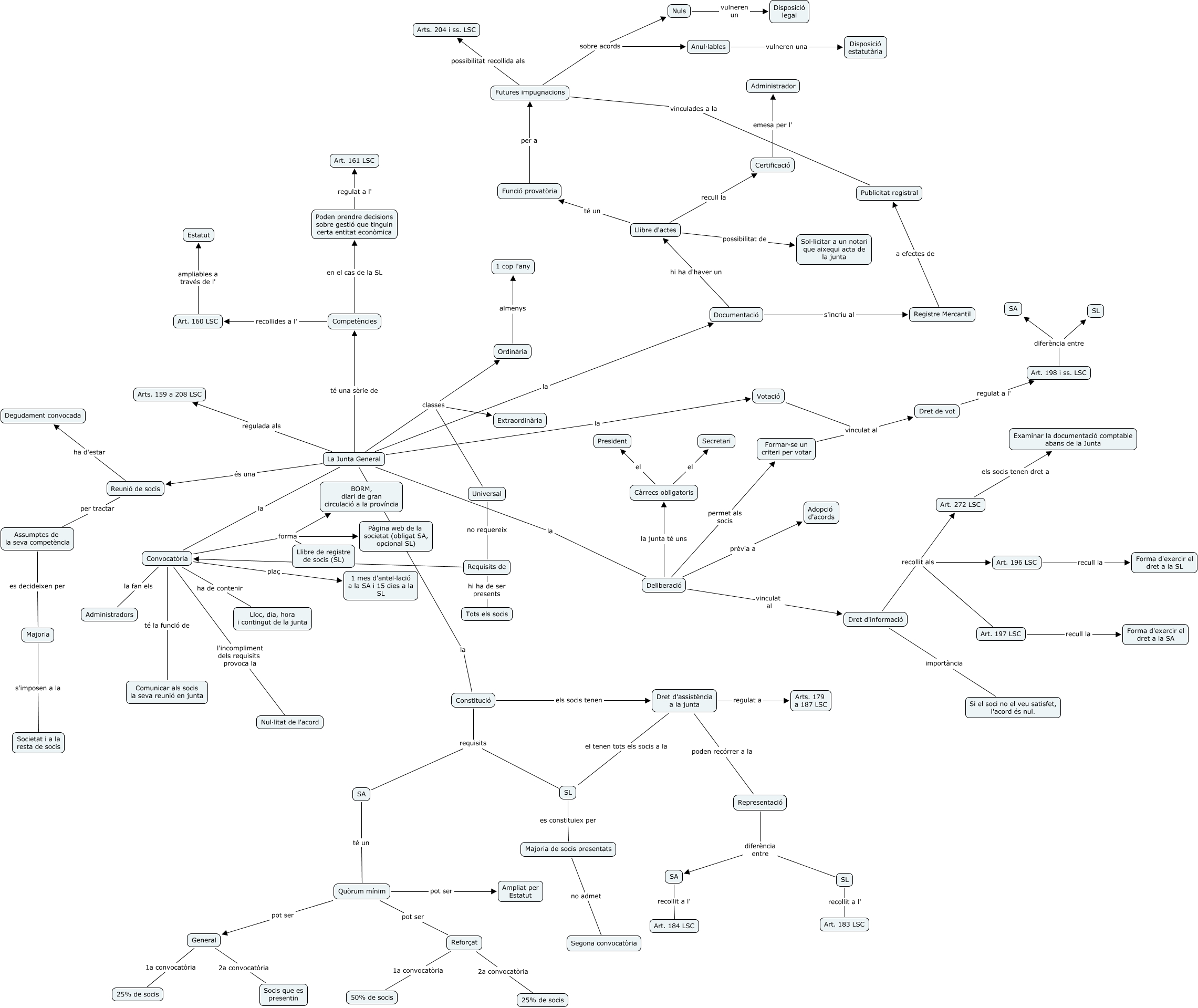 Este Cmap, tiene información relacionada con: Escenari 4 Fiasco a l'Emporium, SA recollit a l' Art. 184 LSC, Convocatòria l'incompliment dels requisits provoca la Nul·litat de l'acord, Futures impugnacions sobre acords Nuls, Poden prendre decisions sobre gestió que tinguin certa entitat econòmica regulat a l' Art. 161 LSC, Anul·lables vulneren una Disposició estatutària, Majoria de socis presentats no admet Segona convocatòria, Futures impugnacions sobre acords Anul·lables, Dret de vot regulat a l' Art. 198 i ss. LSC, Formar-se un criteri per votar vinculat al Dret de vot, Deliberació la junta té uns Càrrecs obligatoris, Convocatòria la fan els Administradors, Quòrum mínim pot ser General, Llibre d'actes recull la Certificació, Dret d'assistència a la junta poden recórrer a la Representació, Convocatòria forma Llibre de registre de socis (SL), Representació diferència entre SA, Documentació s'incriu al Registre Mercantil, Llibre d'actes té un Funció provatòria, La Junta General la Deliberació, Deliberació permet als socis Formar-se un criteri per votar