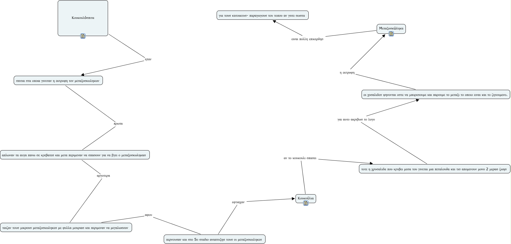 Αυτός ο εννοιολογικός χάρτης, που δημιουργήθηκε με το IHMC Cmap Tools, περιέχει πλήροφορίες που σχετίζονται με: μαρινα ΚΠΕ, Mεταξοσκώληκα ειναι πολλη επικερδησ για τουσ κατοικουσ- παραγωγουσ του τοπου αν γινει σωστα, οι χυσαλιδεσ ψηνονται οστε να μπορεσουμε και παρουμε το μεταξι το οποιο ειναι και το ζητουμενο. η εκτροφη Mεταξοσκώληκα, Κουκούλια αν το κουκουλι σπασει τοτε η χρυσαλιδα που κρυβει μεσα του γινεται μια πεταλουδα και τισ απομενουν μονο 2 μερασ ζωησ, περνουσαν και στο 5ο σταδιο αναπτυξησ τουσ οι μεταξοσκωληκεσ εφτιαχαν Κουκούλια, σπιτια στα οποια γινοταν η εκτροφη τον μεταξοσκωληκων πρωτα απλωναν τα αυγα πανω σε κρεβατεσ και μετα περιμεναν να σπασουν για να βγει ο μεταξοσκωληκασ, απλωναν τα αυγα πανω σε κρεβατεσ και μετα περιμεναν να σπασουν για να βγει ο μεταξοσκωληκασ αργοτερα ταιζαν τουσ μικρουσ μεταξοσκωληκεσ με φυλλα μουριασ και περιμεναν να μεγαλωσουν, τοτε η χρυσαλιδα που κρυβει μεσα του γινεται μια πεταλουδα και τισ απομενουν μονο 2 μερασ ζωησ για αυτο ακριβωσ το λογο οι χυσαλιδεσ ψηνονται οστε να μπορεσουμε και παρουμε το μεταξι το οποιο ειναι και το ζητουμενο., ταιζαν τουσ μικρουσ μεταξοσκωληκεσ με φυλλα μουριασ και περιμεναν να μεγαλωσουν αφου περνουσαν και στο 5ο σταδιο αναπτυξησ τουσ οι μεταξοσκωληκεσ, Κουκουλόσπιτα ηταν σπιτια στα οποια γινοταν η εκτροφη τον μεταξοσκωληκων