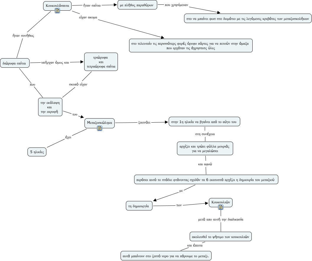 Αυτός ο εννοιολογικός χάρτης, που δημιουργήθηκε με το IHMC Cmap Tools, περιέχει πλήροφορίες που σχετίζονται με: σοφια, Mεταξοσκώληκα ξεκινάει στην 1η ηλικία να βγαίνει από το αύγο του, Κουκουλόσπιτα είχαν ακομα στο τελευταίο τις περισσότερς φορές όροφο πόρτες για να πετούν στην άμαξα που ερχόταν τις άχρηστεσς ύλες, Mεταξοσκώληκα έχει 5 ηλικίες, με πλήθος παραθύρων που χρησίμευαν στο να μπαίνει φωσ στο δωμάτιο με τις λεγόμενες κρεβάτες των μεταξοσκολήκων, Κουκουλόσπιτα ήταν σπίτια με πλήθος παραθύρων, την εκόλαψη και την εκροφή του Mεταξοσκώληκα, περάσει αυτό το στάδιο φτάνοντας σχεδόν τα 6 εκατοστά αρχίζει η δημιουρία του μεταξιού με τη δημιουργία, τριώροφα και τετραώροφα σπίτια σκοπό είχαν την εκόλαψη και την εκροφή, διώροφα σπίτια υπήρχαν όμως και τριώροφα και τετραώροφα σπίτια, στην 1η ηλικία να βγαίνει από το αύγο του στη συνέχεια αρχίζει και τρώει φύλλα μουριάς για να μεγαλώσει, Κουκουλιών μετά απο αυτή την διαδικασία ακολουθεί το ψήσιμο των κουκουλιών, Κουκουλόσπιτα ήταν συνήθως διώροφα σπίτια, διώροφα σπίτια που την εκόλαψη και την εκροφή, τη δημιουργία των Κουκουλιών, ακολουθεί το ψήσιμο των κουκουλιών και έπειτα αυτά μπαίνουν στο ζεστό νερο για να πάρουμε το μεταξι., αρχίζει και τρώει φύλλα μουριάς για να μεγαλώσει και αφού περάσει αυτό το στάδιο φτάνοντας σχεδόν τα 6 εκατοστά αρχίζει η δημιουρία του μεταξιού