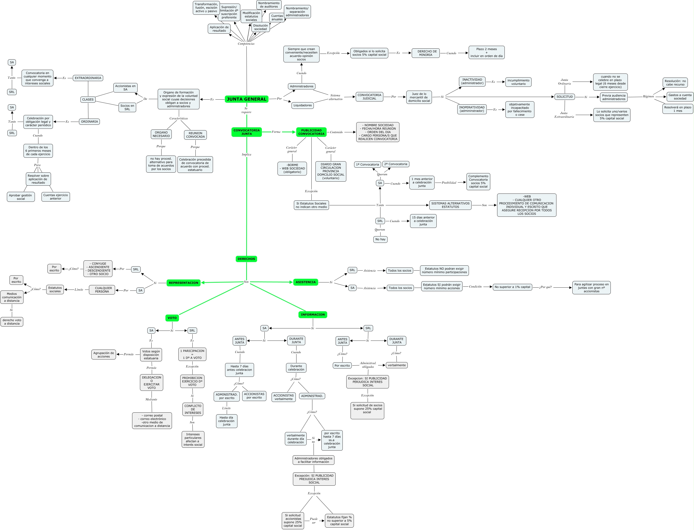 Este Cmap, tiene información relacionada con: CMAP PBL 4, REPRESENTACION Si SRL, Medios comunicación a distancia Si derecho voto a distancia, Hasta 7 días antes celebracion junta ¿Cómo? ACCIONISTAS por escrito, JUNTA GENERAL Por Administradores, JUNTA GENERAL Competencias Nombramiento/ separación administradores, ASISTENCIA Si SRL, Celebración por obligación legal y carácter periódico Tanto SA, Si Estatutos Sociales no indican otro medio Tanto SA, ANTES JUNTA ¿Cómo? Por escrito, CONVOCATORIA JUNTA Implica DERECHOS, INFORMACION Si SA, Estatutos SI podrán exigir número mínimo acciones Condición No superior a 1% capital, verbalmente durante día celebración Si no Administradores obligados a facilitar información, verbalmente durante día celebración Si no por escrito hasta 7 días ss.a celebración junta, REUNION CONVOCADA Porque Celebración precedida de convocatoria de acuerdo con proced. estatuario, Durante celebración ¿Cómo? ADMINISTRAD., Organo de formación y expresión de la voluntad social cuyas decisiones obligan a socios y administradores De Accionistas en SA, Previa audiencia administradores Régimen Gastos a cuenta sociedad, 1 PARICIPACION = 1 Dº A VOTO Excepción PROHIBICION EJERCICIO Dº VOTO, Administradores obligados a facilitar información ???? Excepción: SI PUBLICIDAD PREJUDICA INTERES SOCIAL