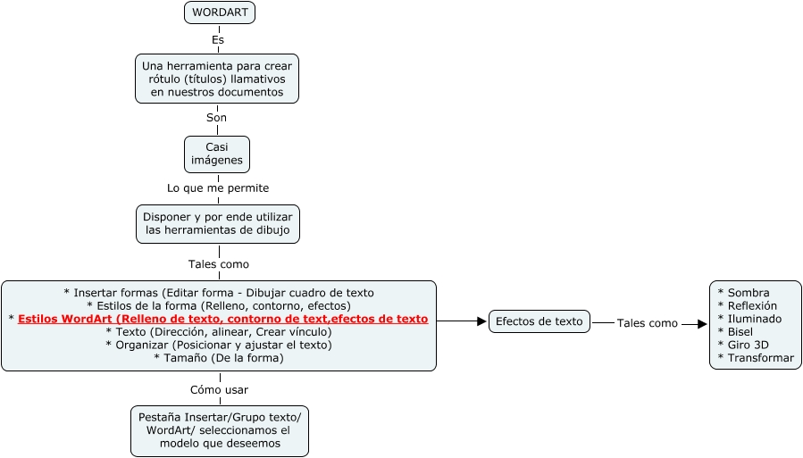 Este Cmap, tiene información relacionada con: MAPA CONCEPTUAL WORDART, Una herramienta para crear rótulo (títulos) llamativos en nuestros documentos Son Casi imágenes, Casi imágenes Lo que me permite Disponer y por ende utilizar las herramientas de dibujo, WORDART Es Una herramienta para crear rótulo (títulos) llamativos en nuestros documentos, Disponer y por ende utilizar las herramientas de dibujo Tales como * Insertar formas (Editar forma - Dibujar cuadro de texto * Estilos de la forma (Relleno, contorno, efectos) * Estilos WordArt (Relleno de texto, contorno de text,efectos de texto * Texto (Dirección, alinear, Crear vínculo) * Organizar (Posicionar y ajustar el texto) * Tamaño (De la forma), * Insertar formas (Editar forma - Dibujar cuadro de texto * Estilos de la forma (Relleno, contorno, efectos) * Estilos WordArt (Relleno de texto, contorno de text,efectos de texto * Texto (Dirección, alinear, Crear vínculo) * Organizar (Posicionar y ajustar el texto) * Tamaño (De la forma) ???? Efectos de texto, Efectos de texto Tales como * Sombra * Reflexión * Iluminado * Bisel * Giro 3D * Transformar, * Insertar formas (Editar forma - Dibujar cuadro de texto * Estilos de la forma (Relleno, contorno, efectos) * Estilos WordArt (Relleno de texto, contorno de text,efectos de texto * Texto (Dirección, alinear, Crear vínculo) * Organizar (Posicionar y ajustar el texto) * Tamaño (De la forma) Cómo usar Pestaña Insertar/Grupo texto/ WordArt/ seleccionamos el modelo que deseemos
