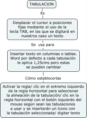 Este Cmap, tiene información relacionada con: MAPA CONCEPTUAL TABULACIONES, Insertar texto en columnas o tablas. Word por defecto a cada tabulación le aplica 1,25cms pero estas se pueden cambiar Cómo establecerlas Activar la regla/ clic en el extremo izquierdo de la regla horizontal para seleccionar la alineación de la tabulación/ clic en la regla horizontal con el botón izquierdo del mouse según sean las tabulaciones a usar y se insertarán un ícono con la tabulación seleccionada/ digitar texto, TABULACION Es Desplazar el cursor a posiciones fijas mediante el uso de la tecla TAB, en las que se digitará en nuestros caso un texto, Desplazar el cursor a posiciones fijas mediante el uso de la tecla TAB, en las que se digitará en nuestros caso un texto Se usa para Insertar texto en columnas o tablas. Word por defecto a cada tabulación le aplica 1,25cms pero estas se pueden cambiar