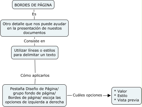 Este Cmap, tiene información relacionada con: MAPA CONCEPTUAL BORDES DE PAGINA, Pestaña Diseño de Página/ grupo fondo de página/ Bordes de página/ escoja las opciones de izquierda a derecha Cuáles opciones * Valor * Estilo * Vista previa, Utilizar líneas o estilos para delimitar un texto Cómo aplicarlos Pestaña Diseño de Página/ grupo fondo de página/ Bordes de página/ escoja las opciones de izquierda a derecha, Otro detalle que nos puede ayudar en la presentación de nuestos documentos Consiste en Utilizar líneas o estilos para delimitar un texto, BORDES DE PÁGINA Es Otro detalle que nos puede ayudar en la presentación de nuestos documentos