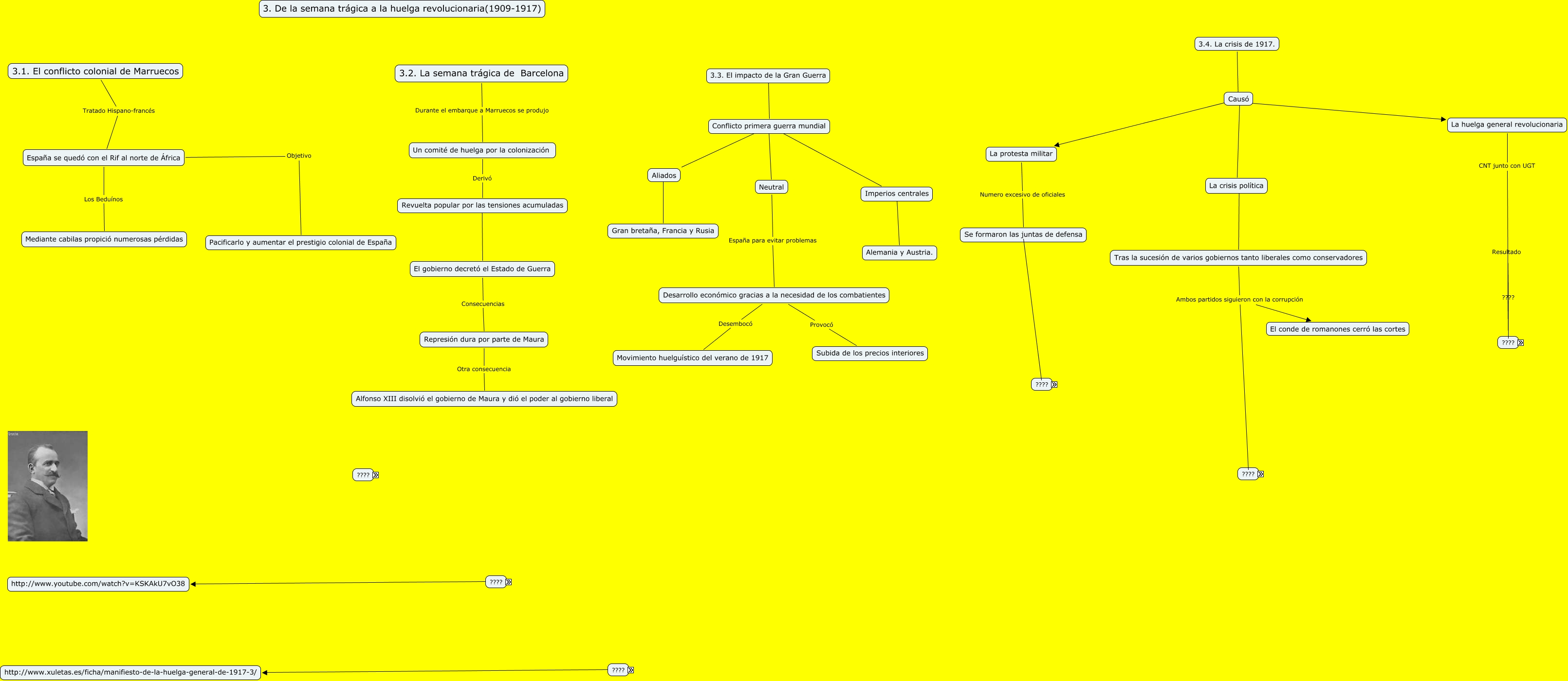 Este Cmap, tiene información relacionada con: tema 11 pnt 3, Reclamaban ???? El no ascenso por mérito de guerra, Causó ???? La crisis política, Tras la sucesión de varios gobiernos tanto liberales como conservadores Ambos partidos siguieron con la corrupción La Lliga regionalista ideó la asamblea de parlamentarios, Revuelta popular por las tensiones acumuladas ???? El gobierno decretó el Estado de Guerra, Tras la sucesión de varios gobiernos tanto liberales como conservadores Ambos partidos siguieron con la corrupción El conde de romanones cerró las cortes, Represión dura por parte de Maura Otra consecuencia Alfonso XIII disolvió el gobierno de Maura y dió el poder al gobierno liberal, Conflicto primera guerra mundial ???? Neutral, El gobierno decretó el Estado de Guerra Consecuencias Represión dura por parte de Maura, 3.2. La semana trágica de Barcelona Durante el embarque a Marruecos se produjo Un comité de huelga por la colonización, Conflicto primera guerra mundial ???? Imperios centrales, La Lliga regionalista ideó la asamblea de parlamentarios Se convocaron las cortes Pero al ser ilegal la guardia civil la disolvió, Desarrollo económico gracias a la necesidad de los combatientes Desembocó Movimiento huelguístico del verano de 1917, España se quedó con el Rif al norte de África Objetivo Pacificarlo y aumentar el prestigio colonial de España, Reclamaban ???? El aumento salarial, La huelga adquirió un carácter político ya que estas fuerzas de izquierda reclamaban el fin de la monarquía Resultado Aplicación de la Ley Marcial que causó mas de 70 muertos y mas de 200 heridos, Un comité de huelga por la colonización Derivó Revuelta popular por las tensiones acumuladas, 3.3. El impacto de la Gran Guerra Conflicto Conflicto primera guerra mundial, Causó ???? La protesta militar, Conflicto primera guerra mundial ???? Aliados, Se formaron las juntas de defensa ???? Reclamaban