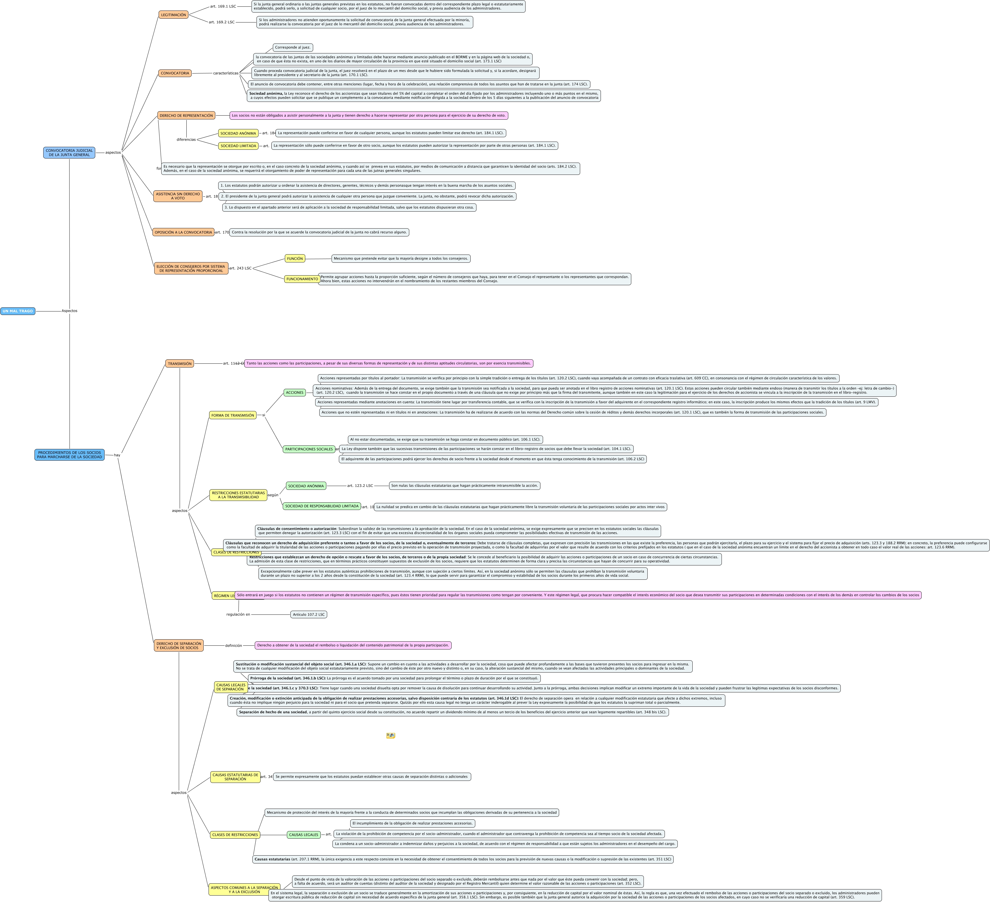 Este Cmap, tiene información relacionada con: Mapa Conceptual 5, PARTICIPACIONES SOCIALES caract. El adquirente de las participaciones podrá ejercer los derechos de socio frente a la sociedad desde el momento en que ésta tenga conocimiento de la transmisión (art. 106.2 LSC), TRANSMISIÓN art. 1112 CC Tanto las acciones como las participaciones, a pesar de sus diversas formas de representación y de sus distintas aptitudes circulatorias, son por esencia transmisibles., CAUSAS LEGALES DE SEPARACIÓN 5 Sustitución o modificación sustancial del objeto social (art. 346.1.a LSC): Supone un cambio en cuanto a las actividades a desarrollar por la sociedad, cosa que puede afectar profundamente a las bases que tuvieron presentes los socios para ingresar en la misma. No se trata de cualquier modificación del objeto social estatutariamente previsto, sino del cambio de éste por otro nuevo y distinto o, en su caso, la alteración sustancial del mismo, cuando se vean afectadas las actividades principales o dominantes de la sociedad., ASPECTOS COMUNES A LA SEPARACIÓN Y A LA EXCLUSIÓN _ Desde el punto de vista de la valoración de las acciones o participaciones del socio separado o excluido, deberán rembolsarse antes que nada por el valor que éste pueda convenir con la sociedad; pero, a falta de acuerdo, será un auditor de cuentas (distinto del auditor de la sociedad y designado por el Registro Mercantil) quien determine el valor razonable de las acciones o participaciones (art. 352 LSC)., CONVOCATORIA JUDICIAL DE LA JUNTA GENERAL aspectos ELECCIÓN DE CONSEJEROS POR SISTEMA DE REPRESENTACIÓN PROPORCINOAL, CONVOCATORIA JUDICIAL DE LA JUNTA GENERAL aspectos CONVOCATORIA, UN MAL TRAGO Aspectos PROCEDIMIENTOS DE LOS SOCIOS PARA MARCHARSE DE LA SOCIEDAD, DERECHO DE REPRESENTACIÓN forma Es necesario que la representación se otorgue por escrito o, en el caso concreto de la sociedad anónima, y cuando así se prevea en sus estatutos, por medios de comunicación a distancia que garanticen la identidad del socio (arts. 184.2 LSC). Además, en el caso de la sociedad anónima, se requerirá el otorgamiento de poder de representación para cada una de las jutnas generales singulares., ACCIONES según Acciones nominativas: Además de la entrega del documento, se exige también que la transmisión sea notificada a la sociedad, para que pueda ser anotada en el libro registro de acciones nominativas (art. 120.1 LSC). Estas acciones pueden circular también mediante endoso (manera de transmitir los títulos a la orden –ej: letra de cambio-) (art. 120.2 LSC), cuando la transmisión se hace constar en el propio documento a través de una cláusula que no exige por principio más que la firma del transmitente, aunque también en este caso la legitimación para el ejercicio de los derechos de accionista se vincula a la inscripción de la transmisión en el libro-registro., CONVOCATORIA JUDICIAL DE LA JUNTA GENERAL aspectos OPOSICIÓN A LA CONVOCATORIA, FORMA DE TRANSMISIÓN si PARTICIPACIONES SOCIALES, TRANSMISIÓN aspectos FORMA DE TRANSMISIÓN, RESTRICCIONES ESTATUTARIAS A LA TRANSMISIBILIDAD según SOCIEDAD ANÓNIMA, DERECHO DE SEPARACIÓN Y EXCLUSIÓN DE SOCIOS aspectos CLASES DE RESTRICCIONES, DERECHO DE SEPARACIÓN Y EXCLUSIÓN DE SOCIOS aspectos CAUSAS LEGALES DE SEPARACIÓN, DERECHO DE SEPARACIÓN Y EXCLUSIÓN DE SOCIOS aspectos ASPECTOS COMUNES A LA SEPARACIÓN Y A LA EXCLUSIÓN, CONVOCATORIA características El anuncio de convocatoria debe contener, entre otras menciones (lugar, fecha y hora de la celebración), una relación comprensiva de todos los asuntos que han de tratarse en la junta (art. 174 LSC)., CAUSAS ESTATUTARIAS DE SEPARACIÓN art. 347.1 LSC Se permite expresamente que los estatutos puedan establecer otras causas de separación distintas o adicionales, UN MAL TRAGO Aspectos CONVOCATORIA JUDICIAL DE LA JUNTA GENERAL, CLASES DE RESTRICCIONES ???? Restricciones que establezcan un derecho de opción o rescate a favor de los socios, de terceros o de la propia sociedad: Se le concede al beneficiario la posibilidad de adquirir las acciones o participaciones de un socio en caso de concurrencia de ciertas circunstancias. La admisión de esta clase de restricciones, que en términos prácticos constituyen supuestos de exclusión de los socios, requiere que los estatutos determinen de forma clara y precisa las circunstancias que hayan de concurrir para su operatividad.