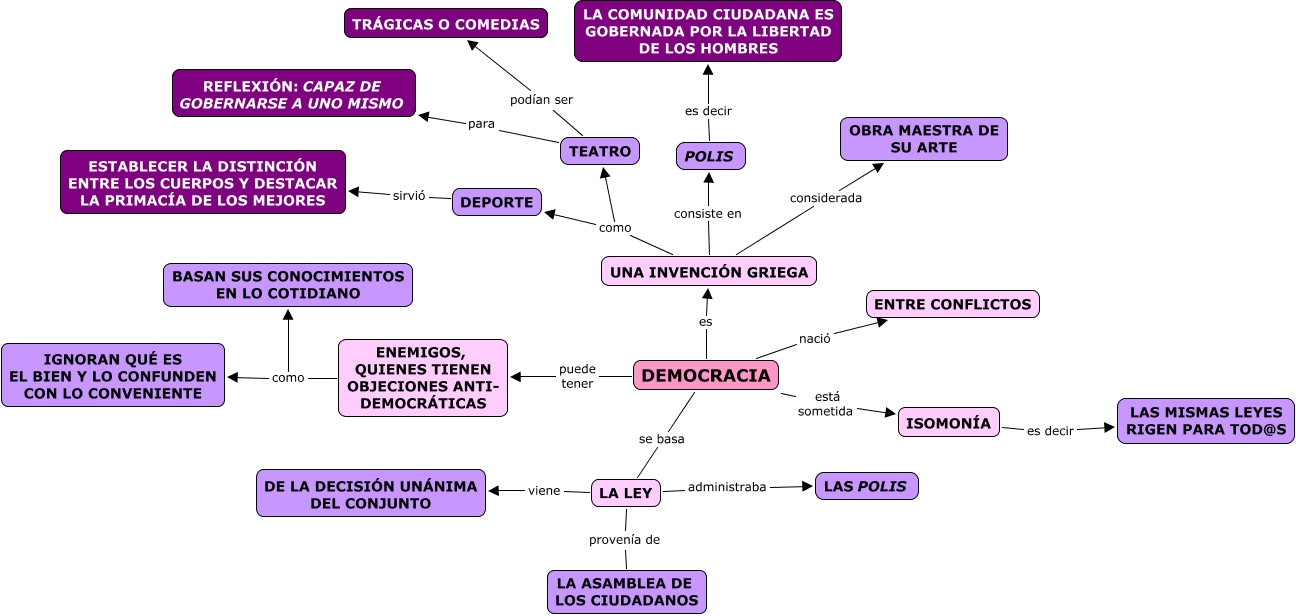 Este Cmap, tiene información relacionada con: LA GRAN INVENCIÓN GRIEGA, LA LEY viene DE LA DECISIÓN UNÁNIMA DEL CONJUNTO, DEMOCRACIA es UNA INVENCIÓN GRIEGA, UNA INVENCIÓN GRIEGA como DEPORTE, UNA INVENCIÓN GRIEGA considerada OBRA MAESTRA DE SU ARTE, DEMOCRACIA se basa LA LEY, DEMOCRACIA puede tener ENEMIGOS, QUIENES TIENEN OBJECIONES ANTI- DEMOCRÁTICAS, LA LEY administraba LAS POLIS, UNA INVENCIÓN GRIEGA consiste en POLIS, UNA INVENCIÓN GRIEGA como TEATRO, DEMOCRACIA está sometida ISOMONÍA, ENEMIGOS, QUIENES TIENEN OBJECIONES ANTI- DEMOCRÁTICAS como BASAN SUS CONOCIMIENTOS EN LO COTIDIANO, ENEMIGOS, QUIENES TIENEN OBJECIONES ANTI- DEMOCRÁTICAS como IGNORAN QUÉ ES EL BIEN Y LO CONFUNDEN CON LO CONVENIENTE, ISOMONÍA es decir LAS MISMAS LEYES RIGEN PARA TOD@S, DEPORTE sirvió ESTABLECER LA DISTINCIÓN ENTRE LOS CUERPOS Y DESTACAR LA PRIMACÍA DE LOS MEJORES, TEATRO para REFLEXIÓN: CAPAZ DE GOBERNARSE A UNO MISMO, DEMOCRACIA nació ENTRE CONFLICTOS, TEATRO podían ser TRÁGICAS O COMEDIAS, POLIS es decir LA COMUNIDAD CIUDADANA ES GOBERNADA POR LA LIBERTAD DE LOS HOMBRES, LA LEY provenía de LA ASAMBLEA DE LOS CIUDADANOS